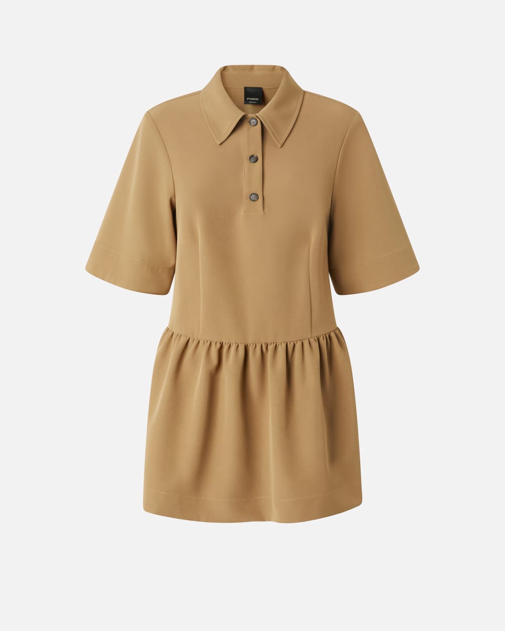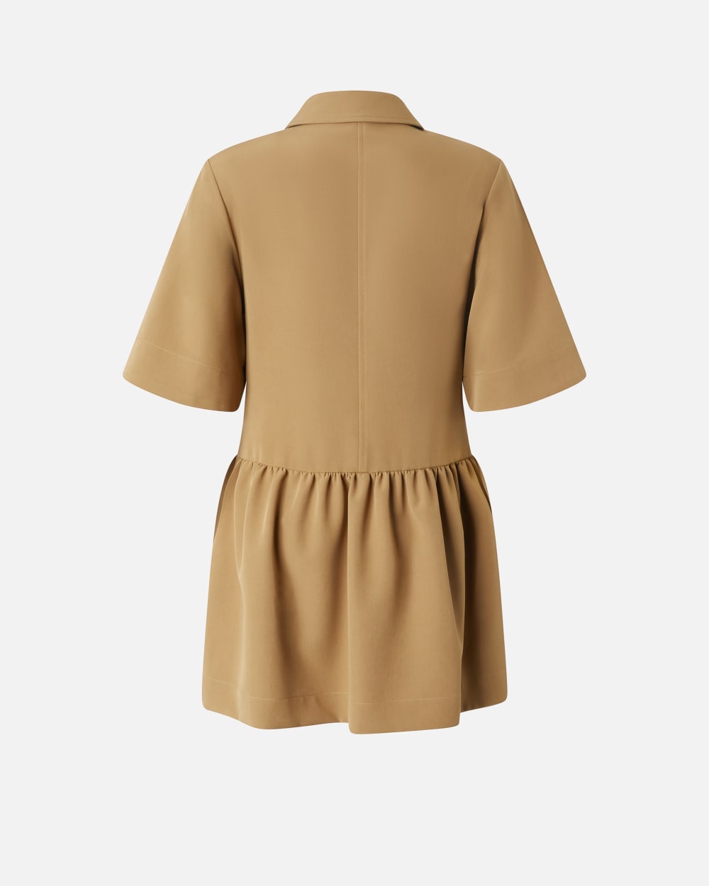 Robe courte féminine en tissu technique stretch à col polo boutonné et manches mi-longues amples. Coupe droite twistée par une jupe courte et légèrement évasée. Une tenue complète et polyvalente à porter au quotidien, quelle que soit loccasion.