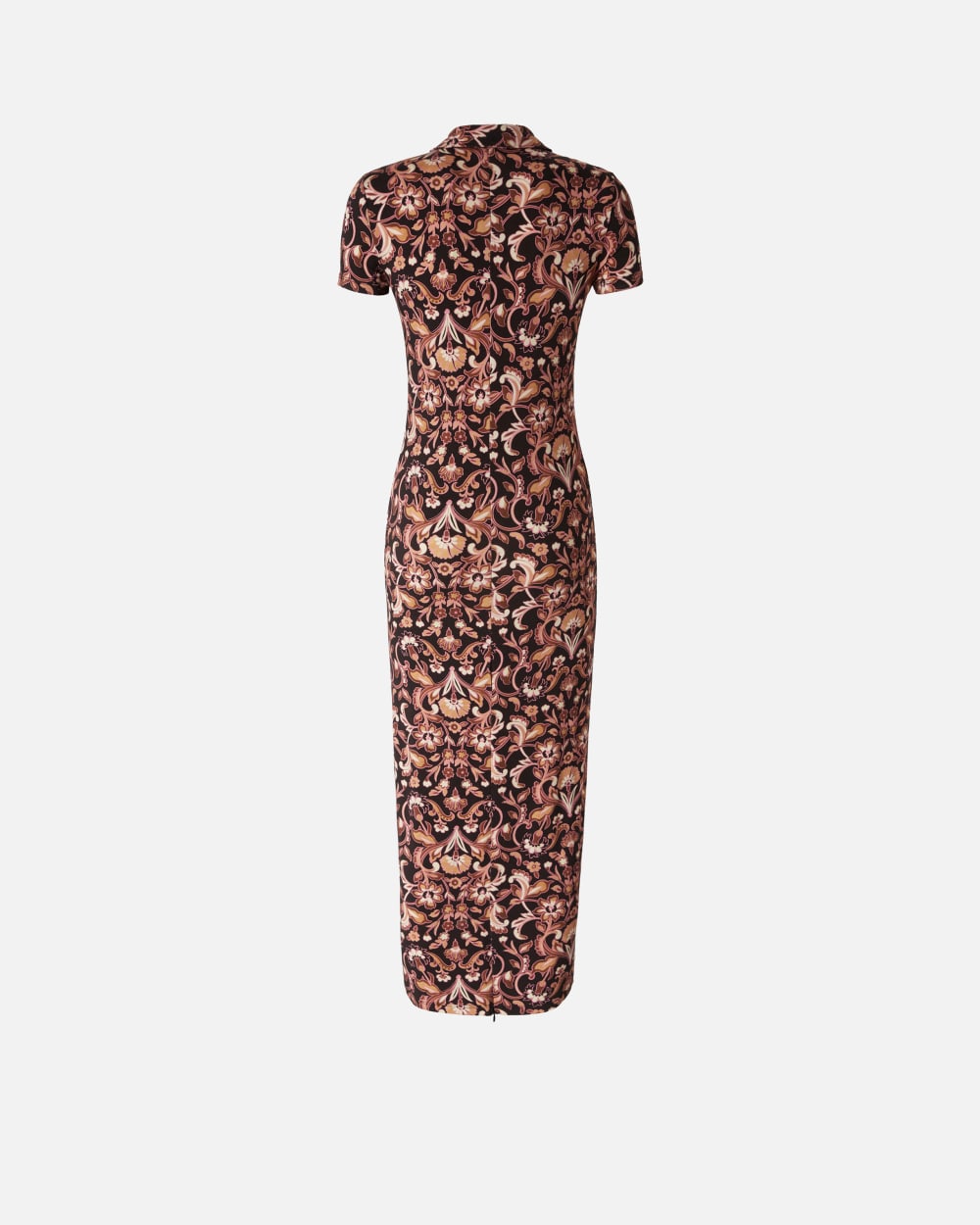 Robe longue ajustée en jersey de viscose stretch avec imprimé floral décoratif. Col polo, manches courtes et fente milieu dos avec fermeture zippée invisible pour une ouverture personnalisée.