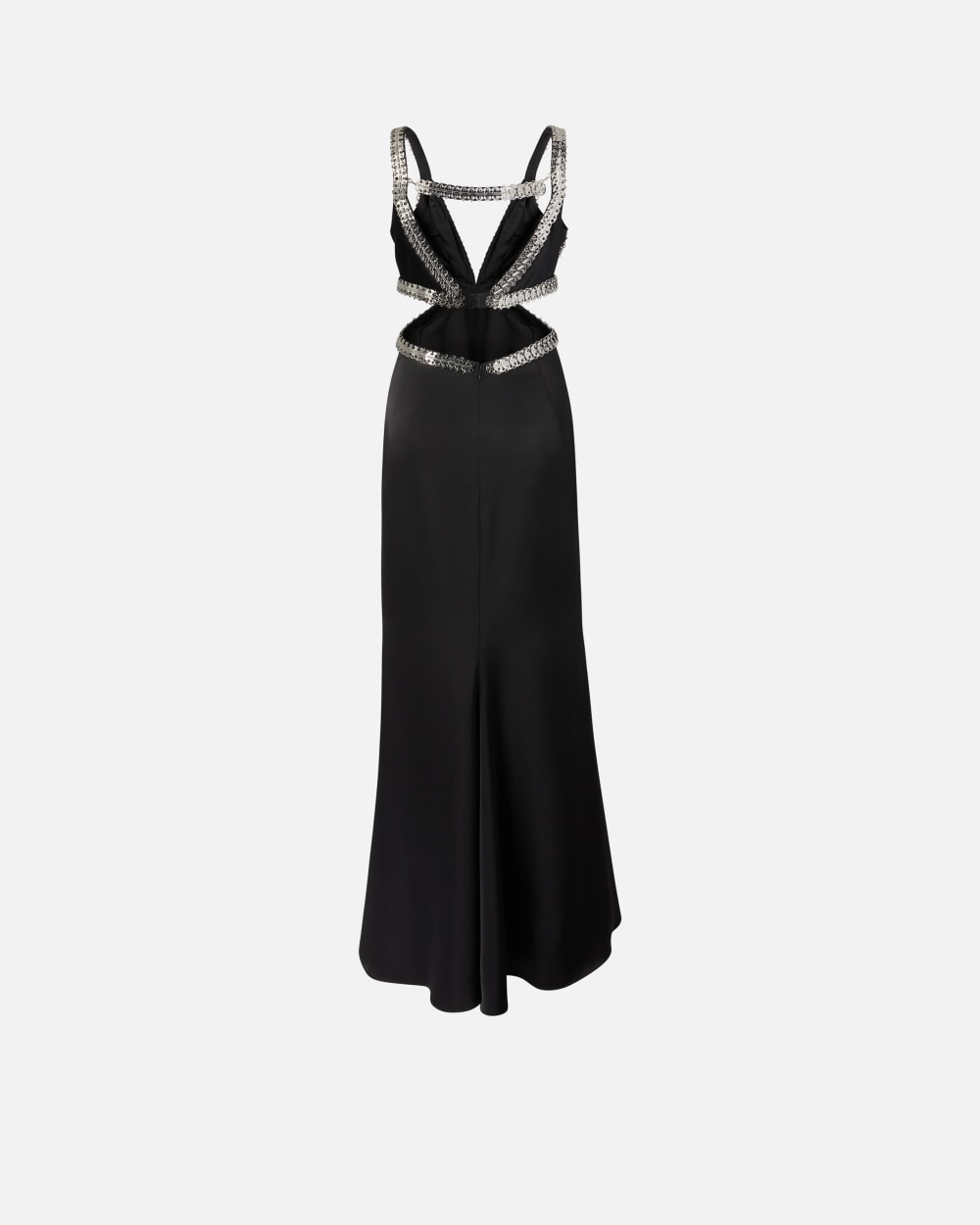 Élégante robe longue sans manches en crêpe envers satin fin, brillant et satiné sur les deux faces. Coupe laissant le dos et les hanches nus avec bretelles, décolleté et détails du corsage bordés dune broderie métallique scintillante sur le devant et au dos. Une longue jupe sirène à petite traîne et fermeture zippée invisible au dos complète le style extrêmement féminin de cette robe de soirée conçue pour les grandes occasions.