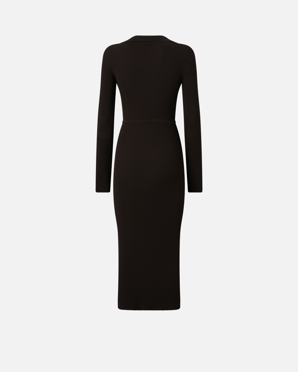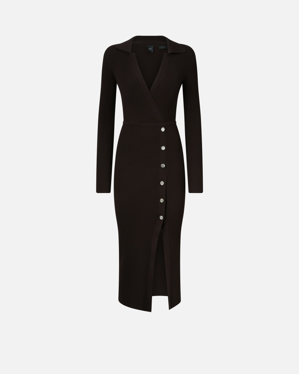 Robe longue en maille côtelée de viscose mélangée stretch. Sa coupe près du corps est rehaussée dun col V croisé féminin sur le devant, surmonté dun col chemise, et dune rangée de boutons en métal doré sur le devant au niveau de la longue fente en bas.