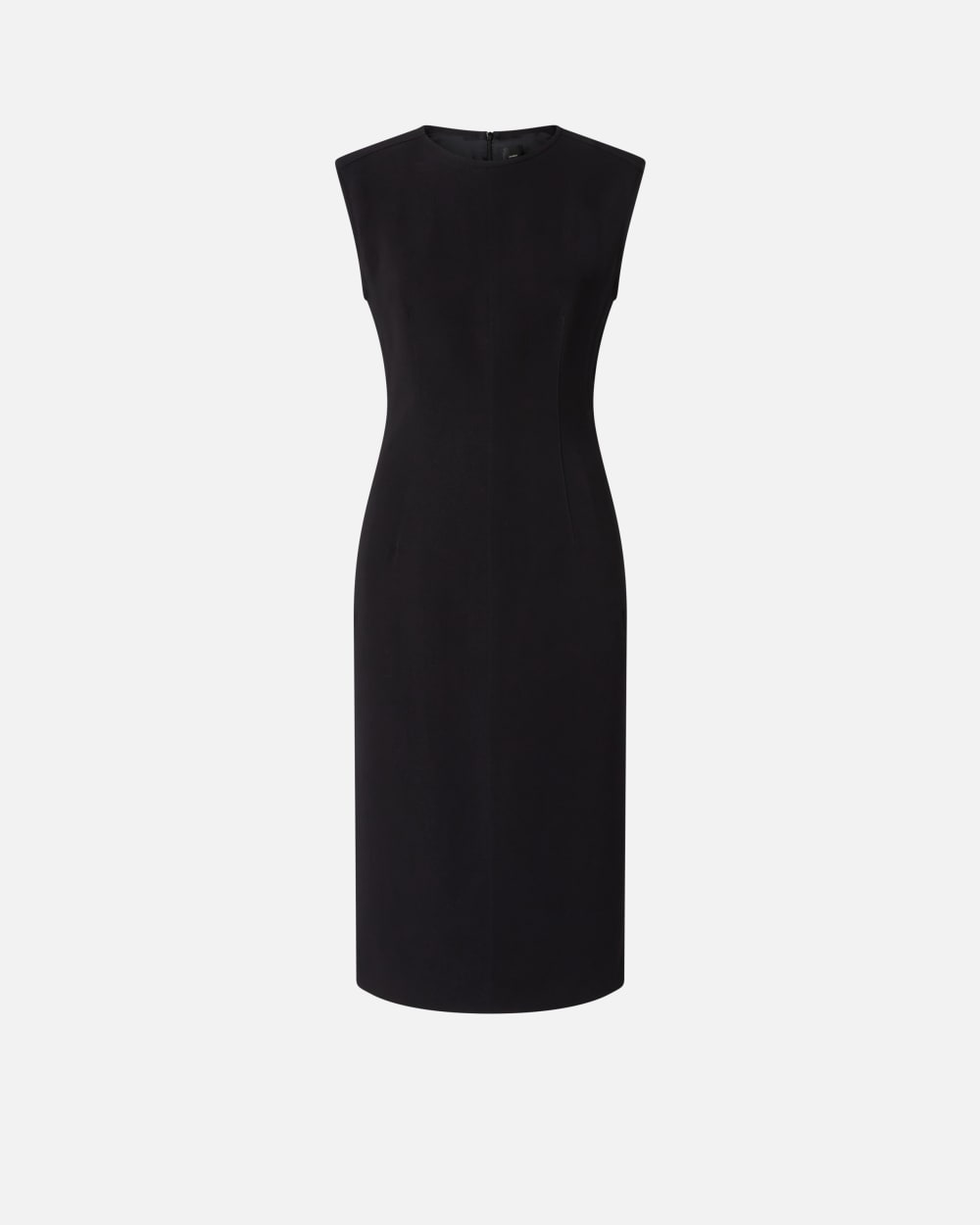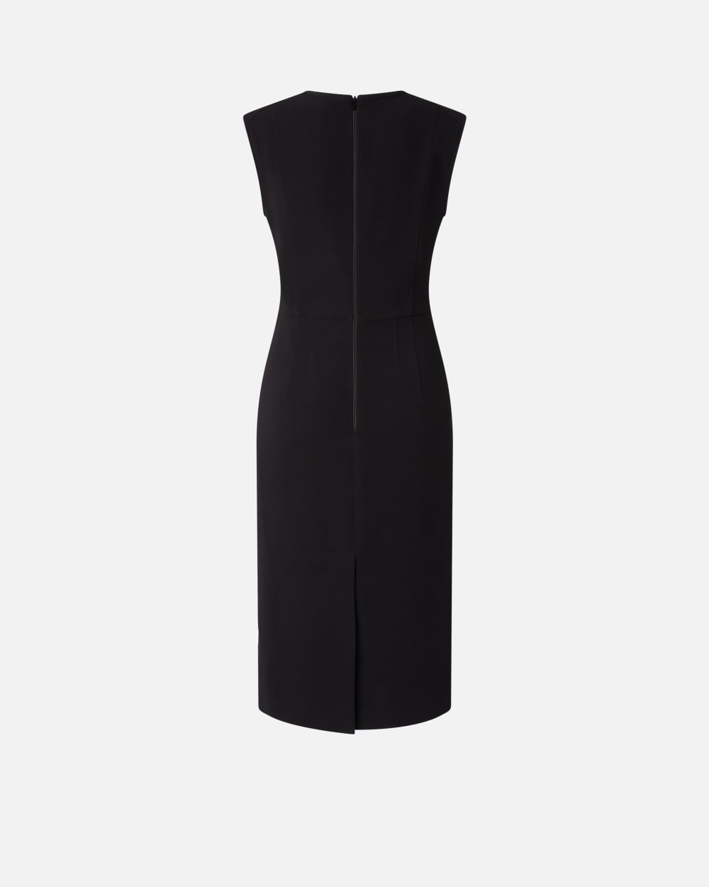 Robe mi-longue pour femme en cady technique, coupe cintrée et sans manches. Cette robe mi-longue est complétée par un col rond et une fente centrale dans le bas du dos, et se présente comme une tenue extrêmement polyvalente, qui convient même aux occasions les plus spéciales. Fermeture zippée invisible au milieu du dos pour une silhouette très épurée et minimaliste, qui souligne son élégance.