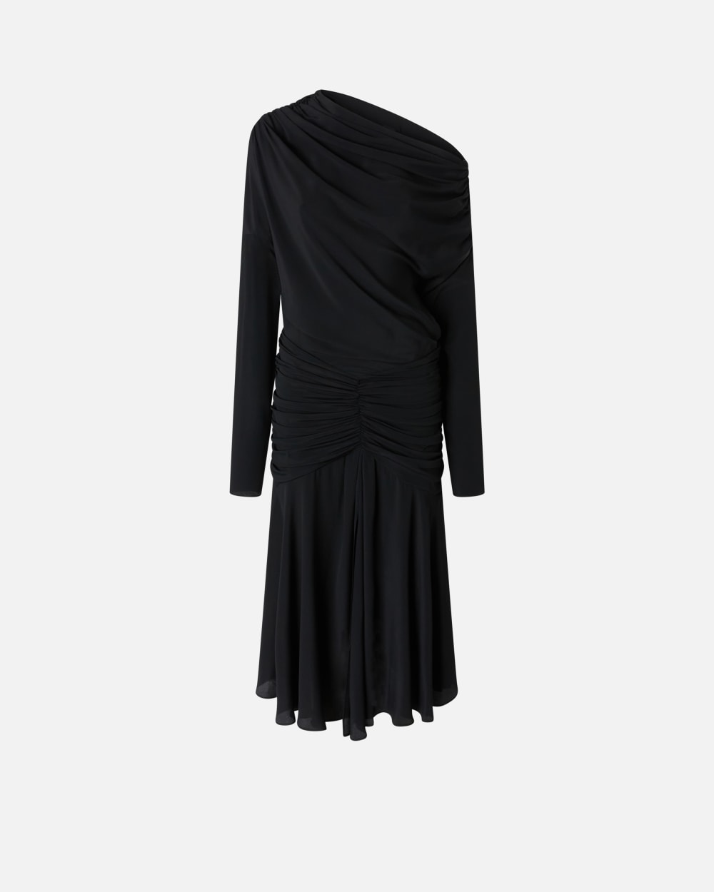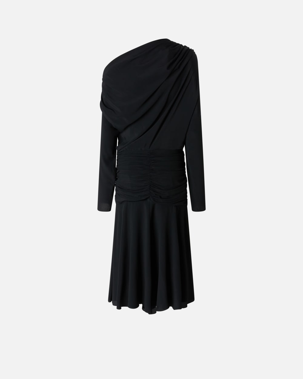 Robe midi légère en crêpe de Chine de soie mélangée stretch caractérisée par des jeux de volumes et de drapés. Encolure asymétrique, laissant une épaule nue, et manches longues. Jupe légèrement plissée à basque froncée à la taille avec fente latérale sur le devant. Le tissu principal est fabriqué avec 69% de viscose provenant de forêts gérées de manière responsable.