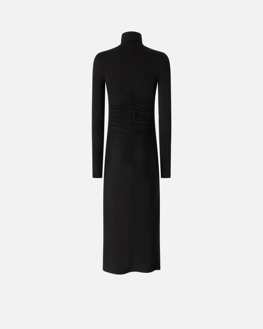 Robe midi en jersey doux de modal stretch, chaud au toucher et agréable sur la peau. Sa coupe près du corps à col montant et manches longues est ornée de fronces et de motifs drapés sur le devant et au dos, ainsi que dune fermeture zippée invisible sur le devant.