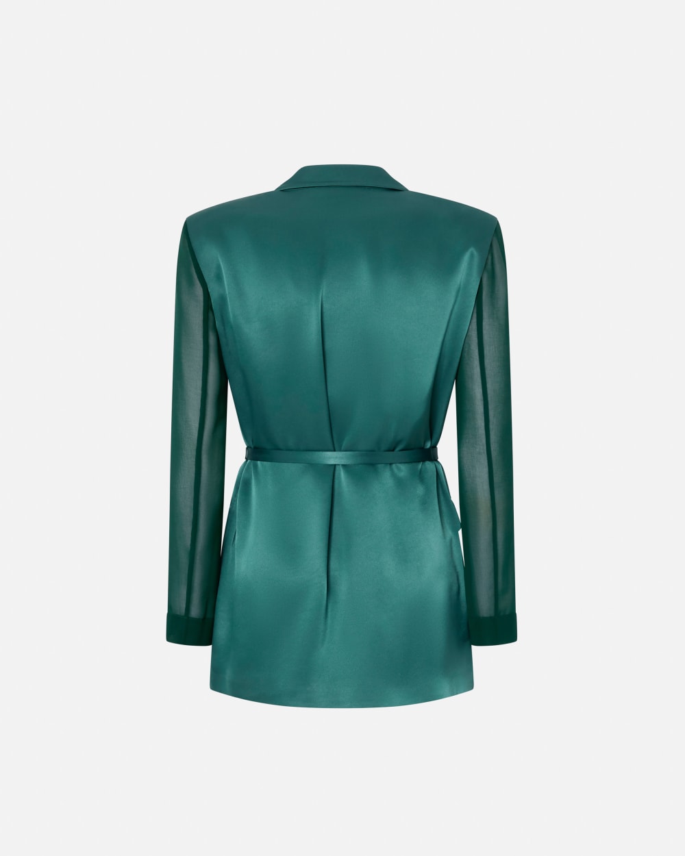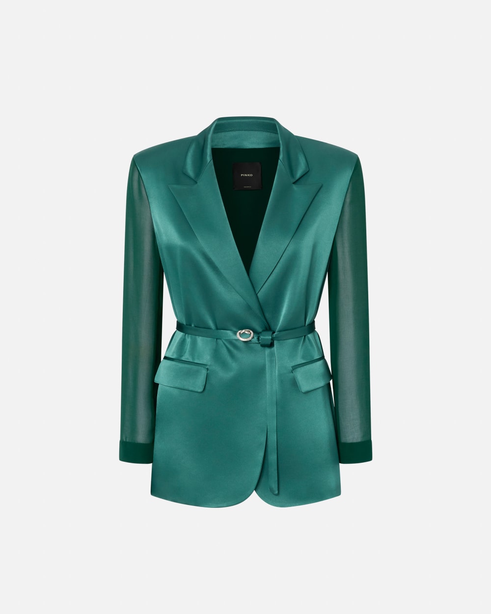 Blazer en satin brillant avec manches longues en crêpe Georgette contrastant semi-transparent. Col à revers et poches plaquées à rabat sur les hanches. La veste est complétée par une ceinture assortie dans le même tissu à nouer à la taille.