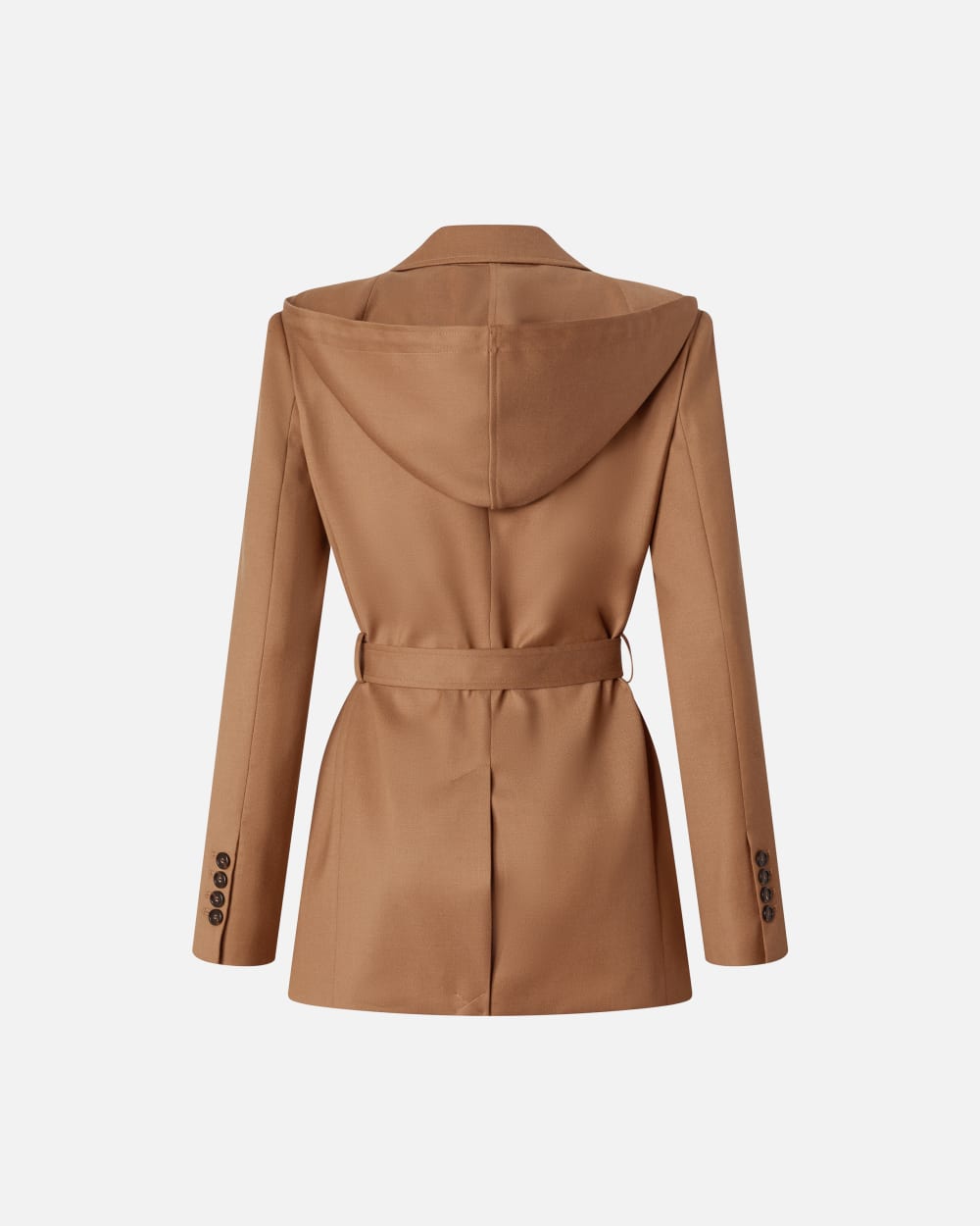 Blazer pour femme en flanelle douce avec col à revers et large capuche réglable par cordon de serrage. Coupe moderne et innovante pour cette veste dhiver à manches longues avec poches à rabat plaqué sur les hanches et ceinture assortie, confectionnée dans le même tissu, ornée dune boucle en métal d’inspiration sportive. Fermeture droite avec boutons. Ce blazer féminin et original ajoutera une touche sporty chic à vos journées au bureau.