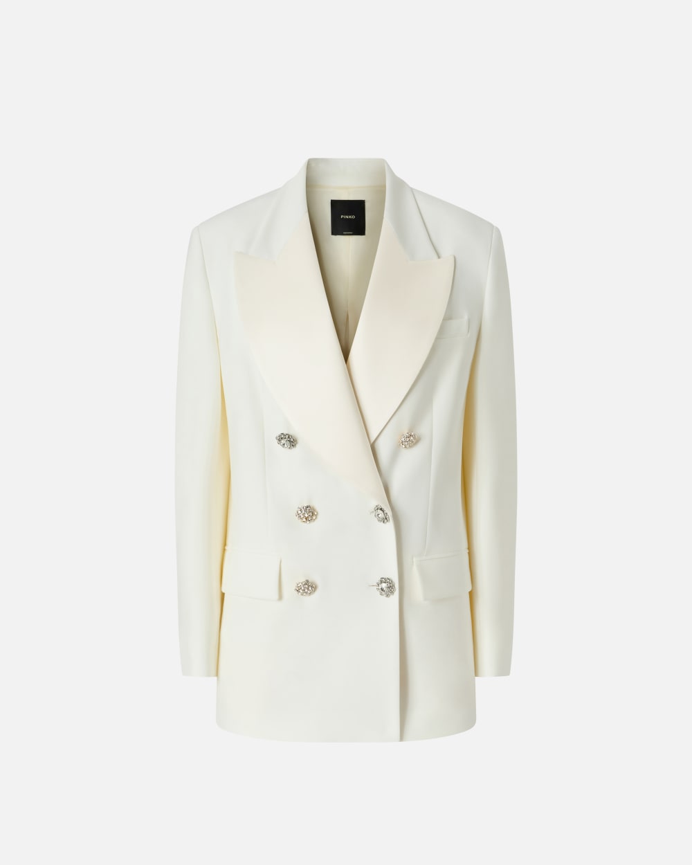 Blazer croisé élégant pour femme en double sergé de viscose stretch à large col à revers en tissu brillant contrastant pour une touche de style encore plus raffiné. Modèle à manches longues à épaulettes avec poches à rabat plaqué sur les hanches et poche poitrine passepoilée. La fente milieu dos dotée dune fermeture zippée invisible permet une ouverture personnalisée. L’élément le plus précieux de ce blazer croisé ? Les boutons bijoux qui ornent la fermeture.