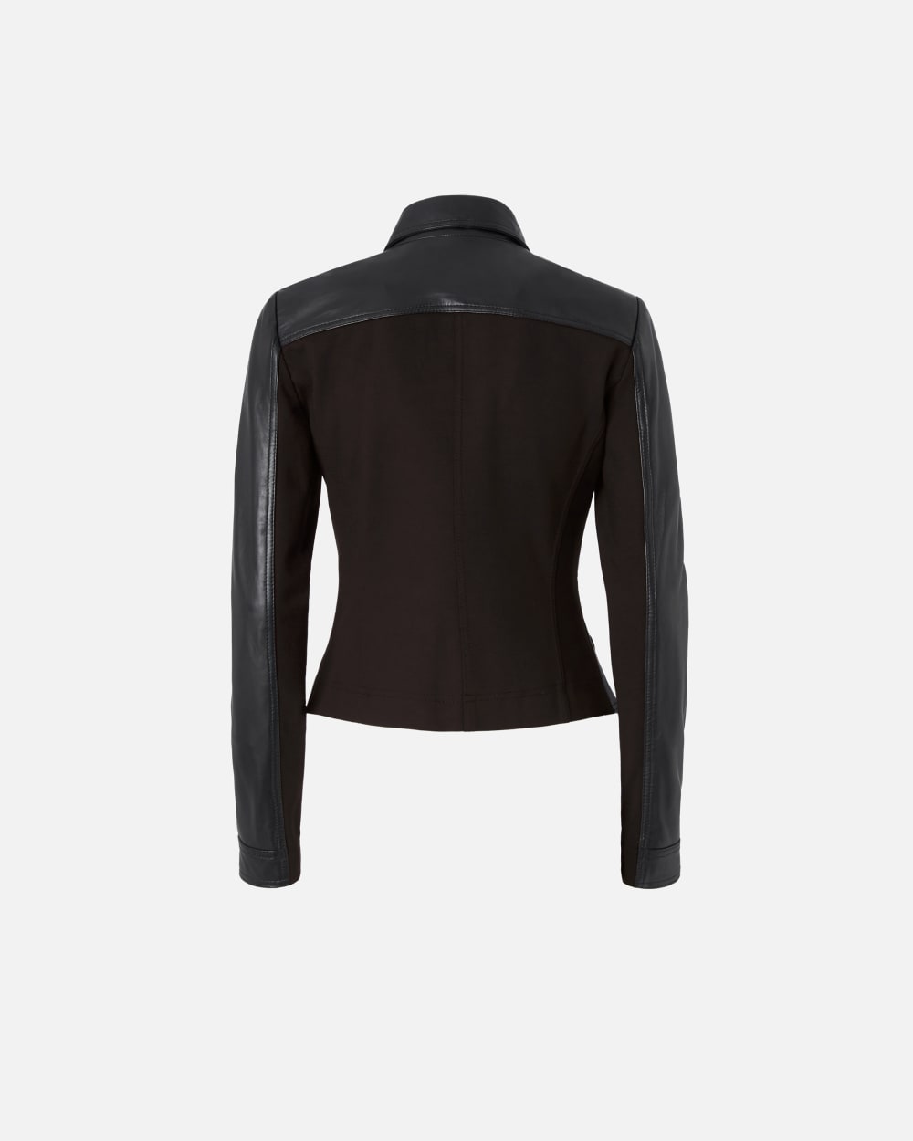 Blouson de motard court en cuir lisse souple avec dos et bas des manches longues en tissu technique de viscose stretch. Coupe ajustée avec col à pointes, poches poitrine plaquées à rabat triangulaire et poches en biais zippées sur les hanches. Modèle doublé de tissu avec fermeture zippée en métal à double curseur.