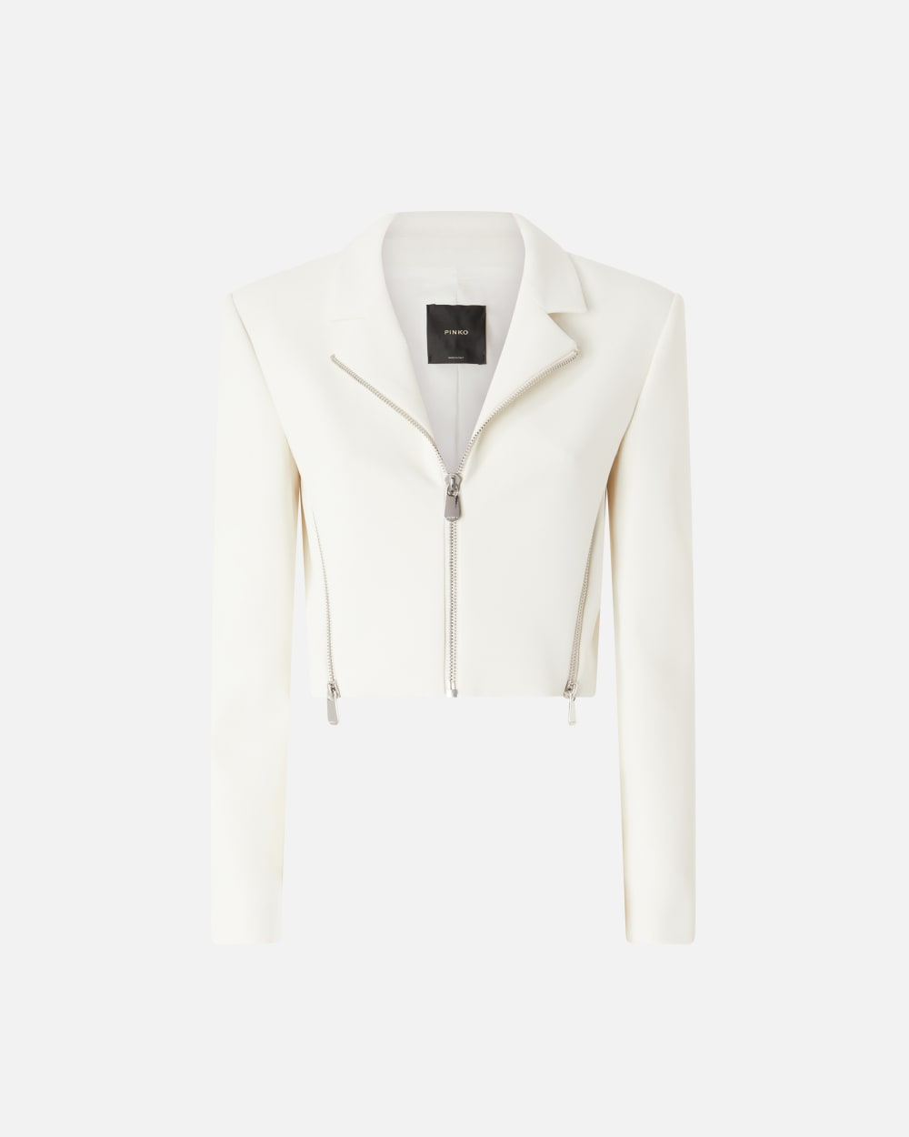 Veste courte en crêpe stretch inspirée du blouson de motard classique en cuir. Petit col à revers, manches longues montées et fermeture zippée en métal de chaque côté. Pièce doublée. Fermeture zippée en métal sur le devant.