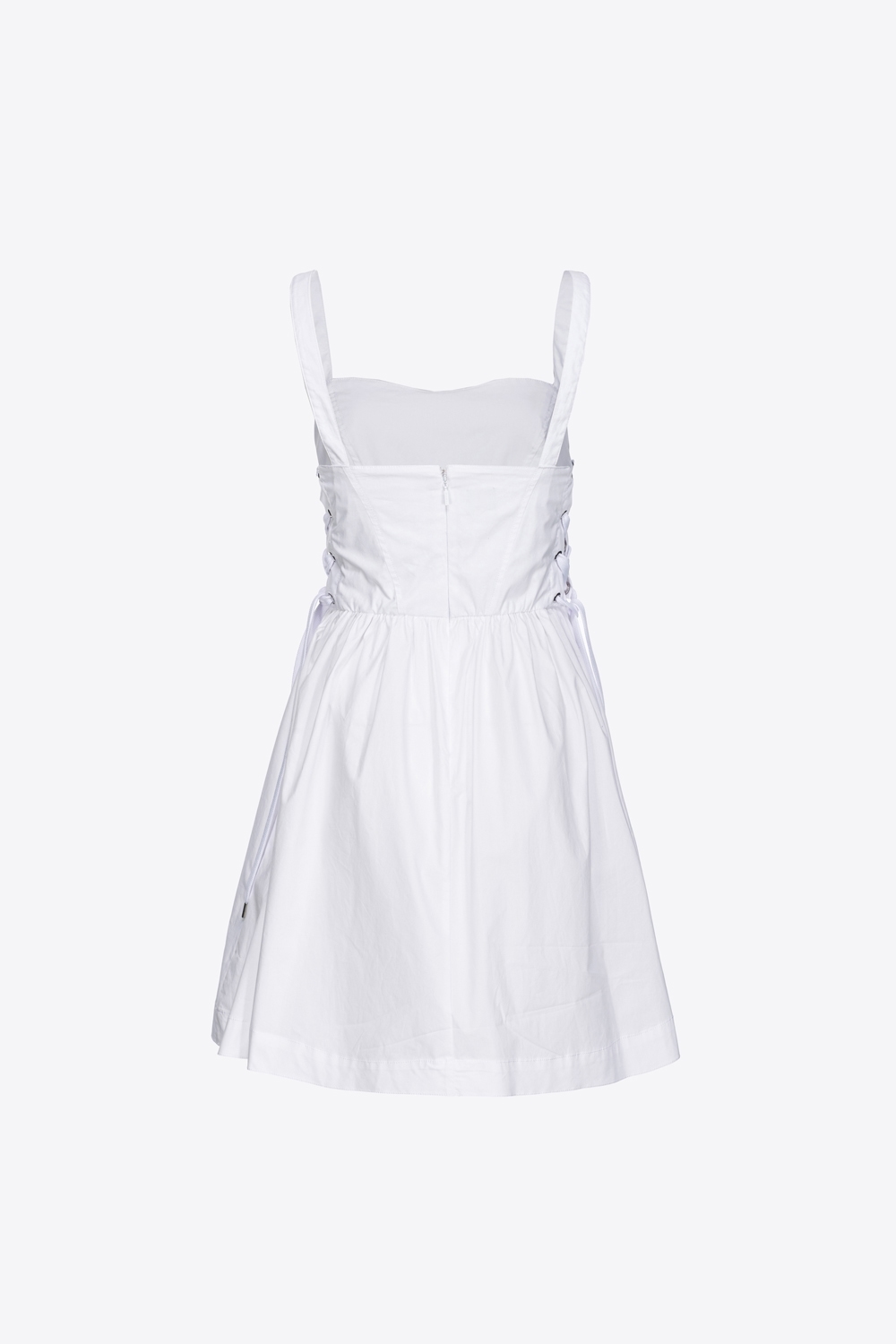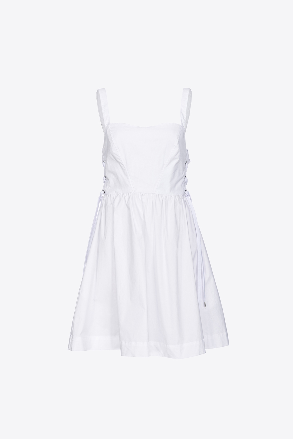 Abito corto senza maniche in popeline di cotone. Top dalla linea aderente, con spalline sottili, scollo a cuore e dettaglio di stringhe incrociate laterali, di ispirazione bustier. Gonna corta dalla linea svasata, con tasche sui fianchi e pieghe morbide. Chiusura con zip invisibile nel centro dietro.