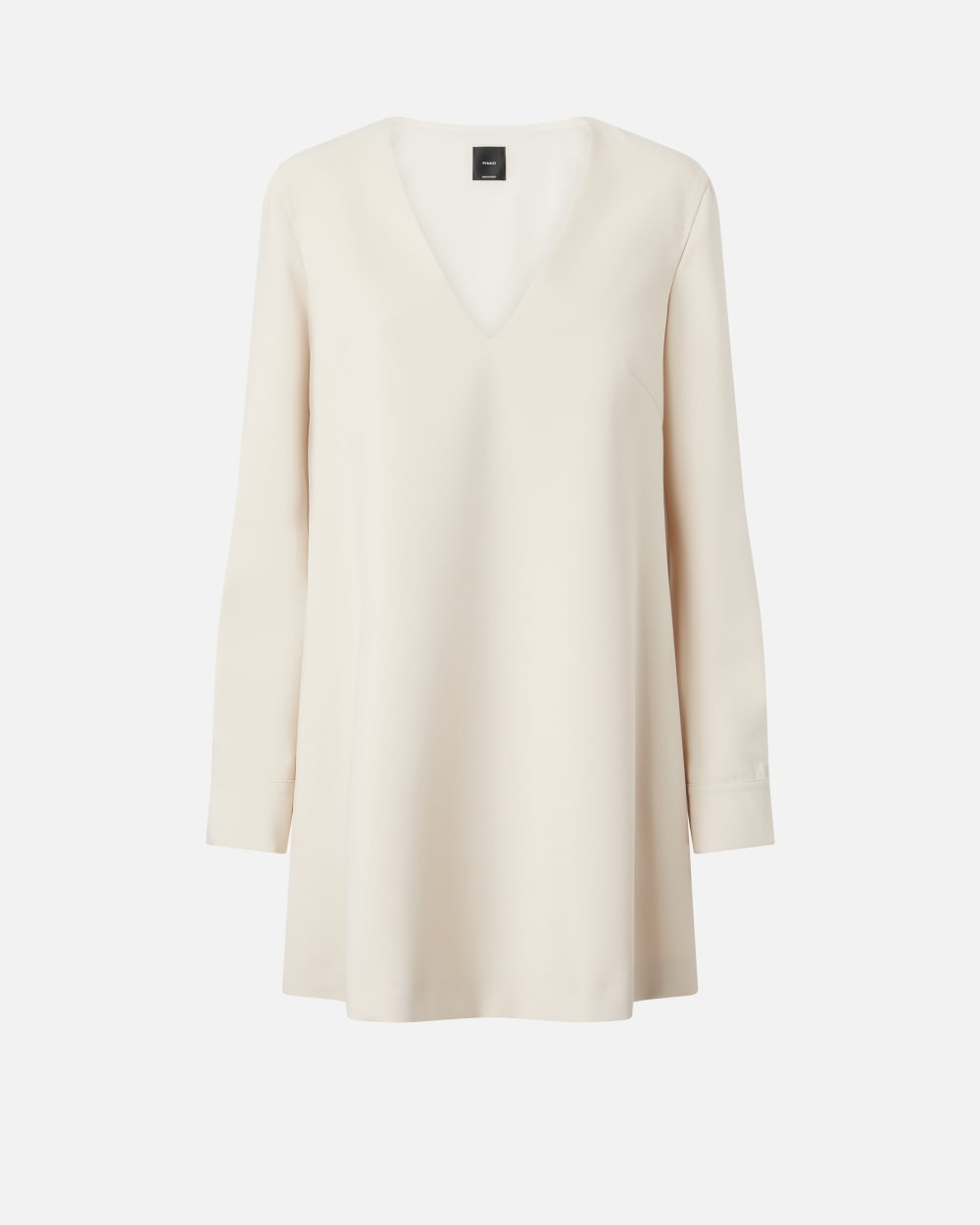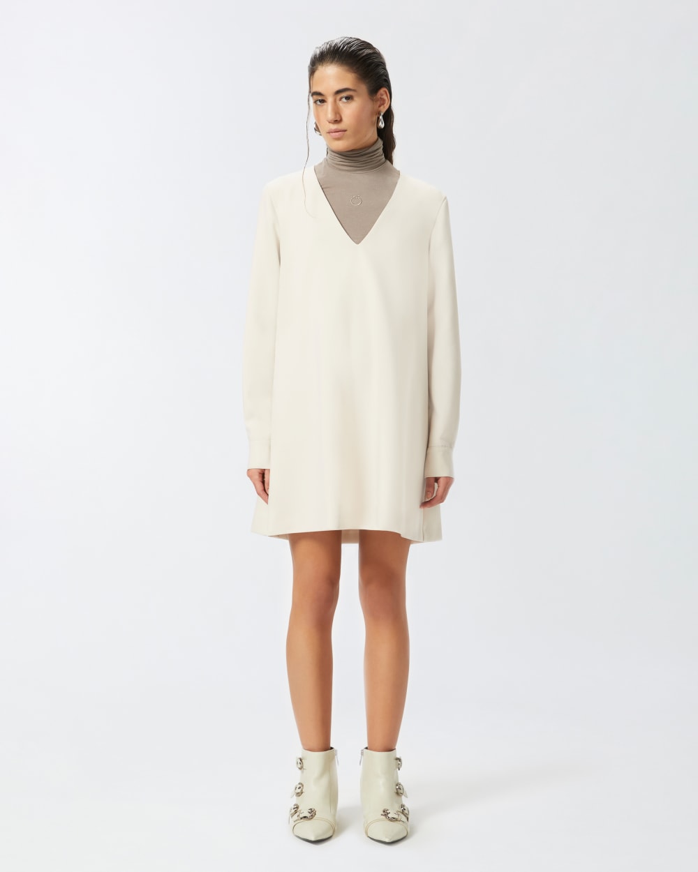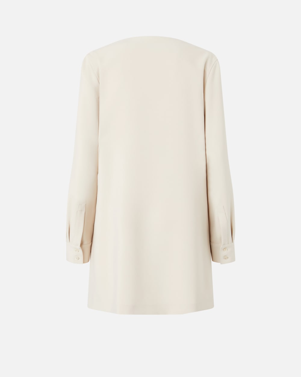 Abito corto a tunica da donna realizzato in doppio tessuto tecnico di viscosa stretch. La silhouette dritta e morbida di questo vestitino è completata da maniche lunghe, dal volume leggermente ampio e da scollo a V, che aggiunge un tocco femminile alle linee minimal dell’abito. Per completare il look, è possibile giocare con gli strati aggiungendo una maglia dolcevita sotto il vestito.