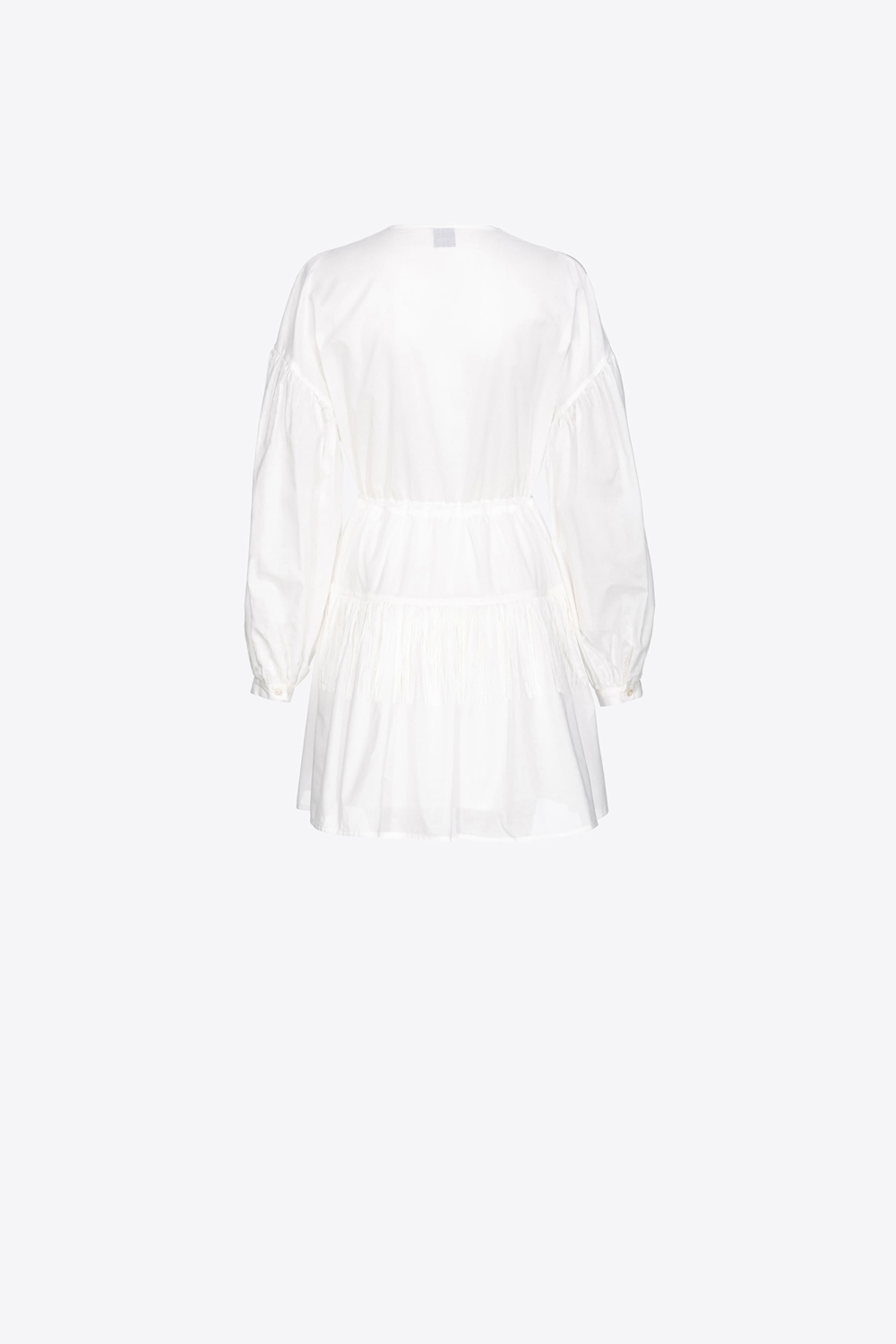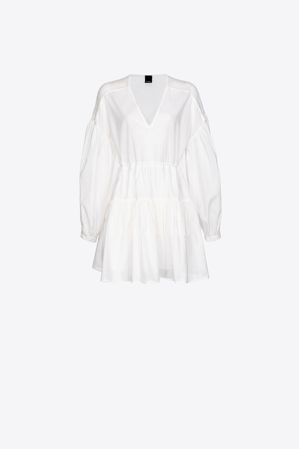 Abito corto in leggera mussola. Scollo a V e maniche lunghe a giro basso con spalle caratterizzate da dettaglio di frange applicate in trasparenza, polsino al fondo e gonna corta caratterizzata da applicazione di frange sottili, sia davanti che sul retro.