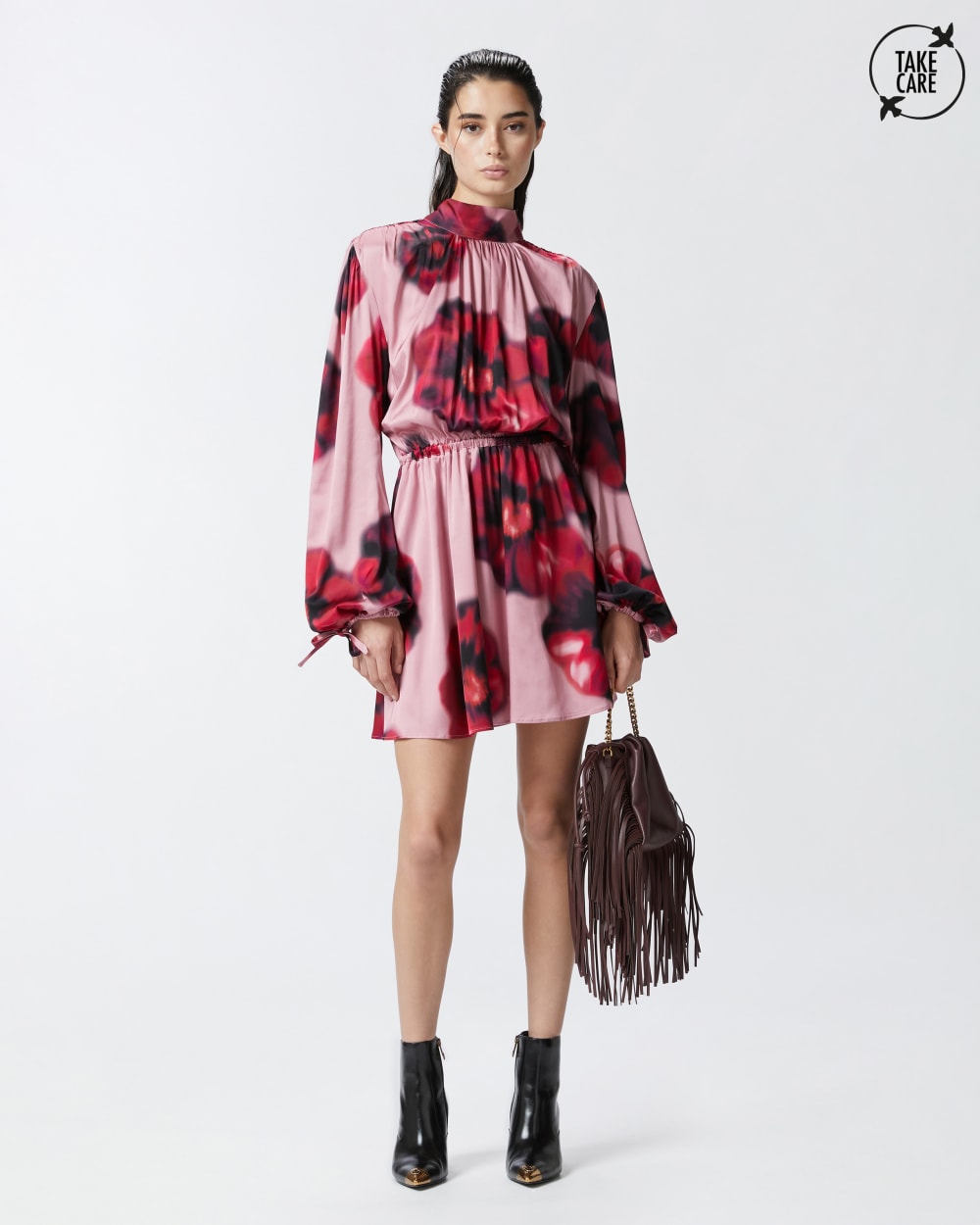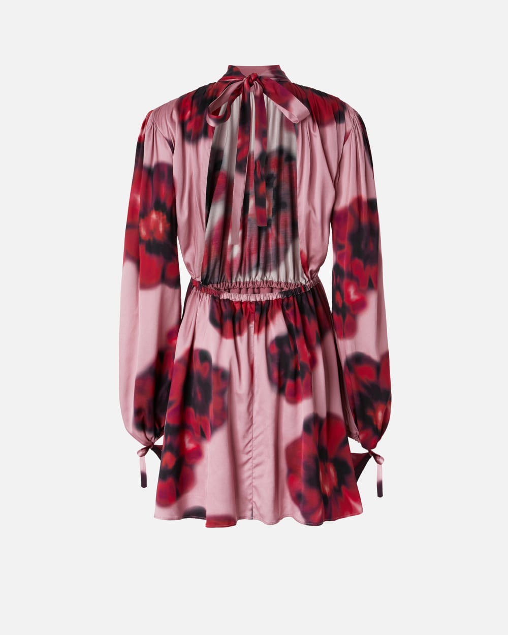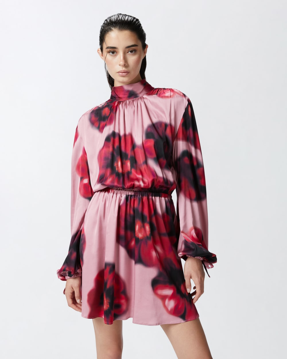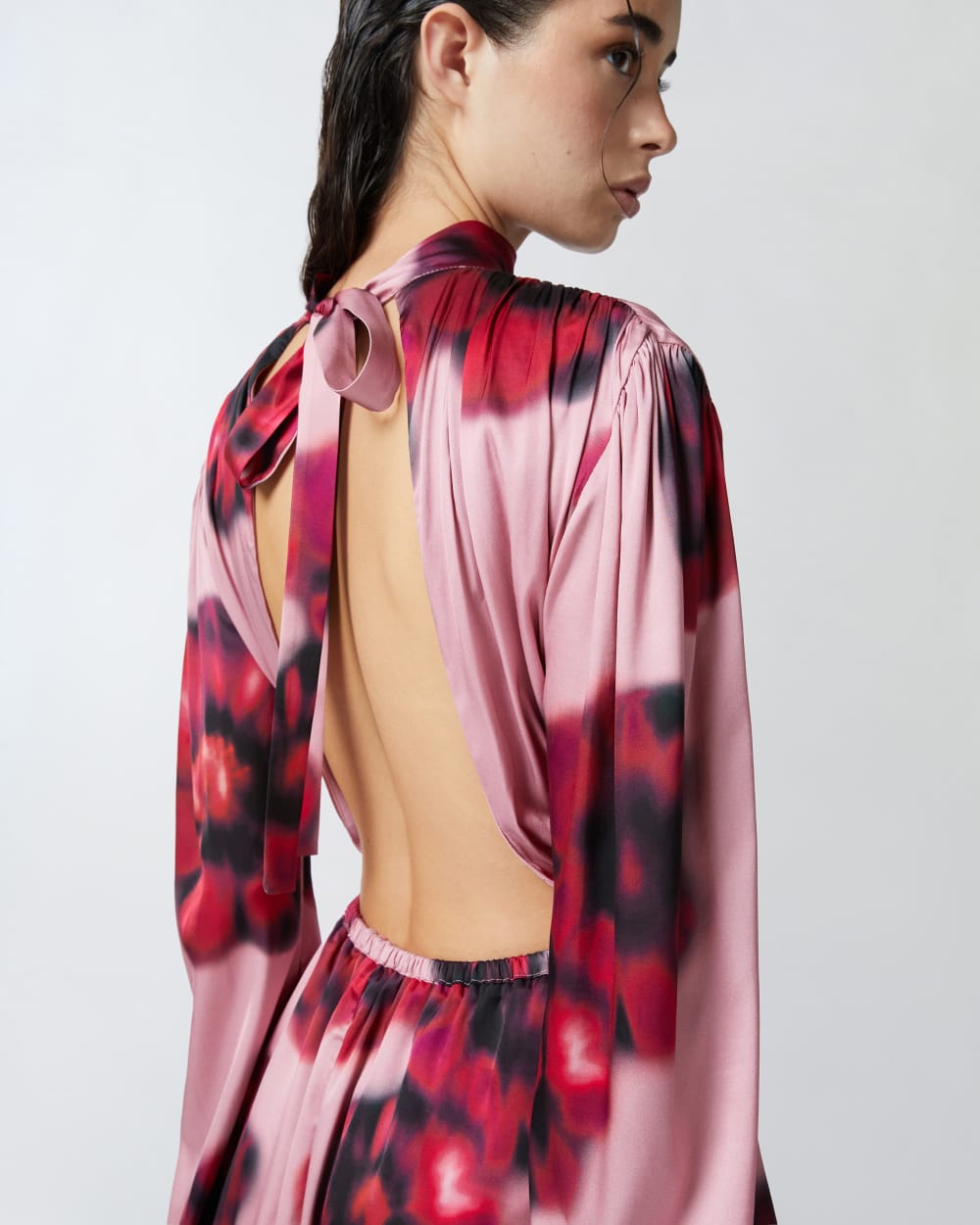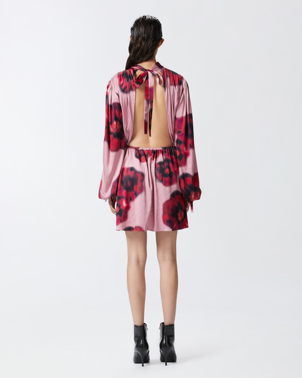 Abito corto a maniche lunghe in leggero tessuto satin matte, dall’effetto leggermente opaco, con stampa floreale. Collo alto con nastrini da allacciare sul retro, dove il maxi cut-out lascia la schiena scoperta. Gonna corta a pieghe morbide con elastico in vita. Il tessuto principale è realizzato con il 51% di viscosa EcoveroTM , da foreste gestite responsabilmente e realizzata con processi a ridotto impatto ambientale.