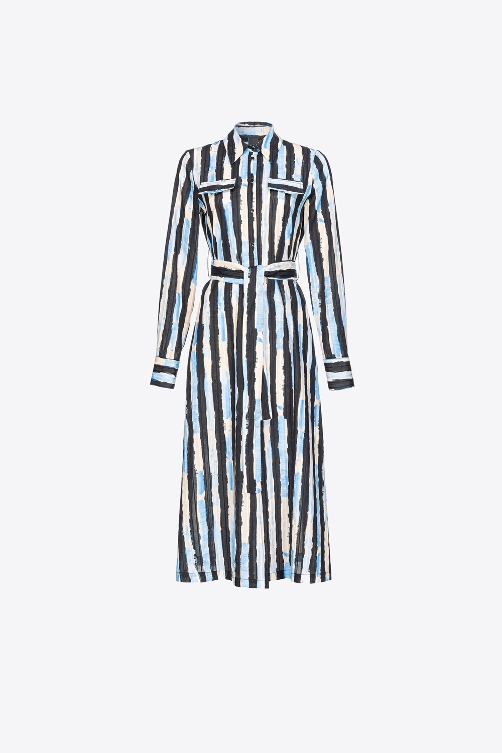 Maxi abito chemisier in mussola di cotone con stampa riga pittorica, dove le righe verticali sembrano essere tracciate da un pennello, presentando le stesse caratteristiche irregolari di un tratto pittorico. Colletto a camicia, taschini con patta e bottone, maniche lunghe, passanti per cintura in vita e cintura in tessuto abbinato da annodare in vita. Gonna lunga dalla linea fluida. Chiusura con bottoni davanti.