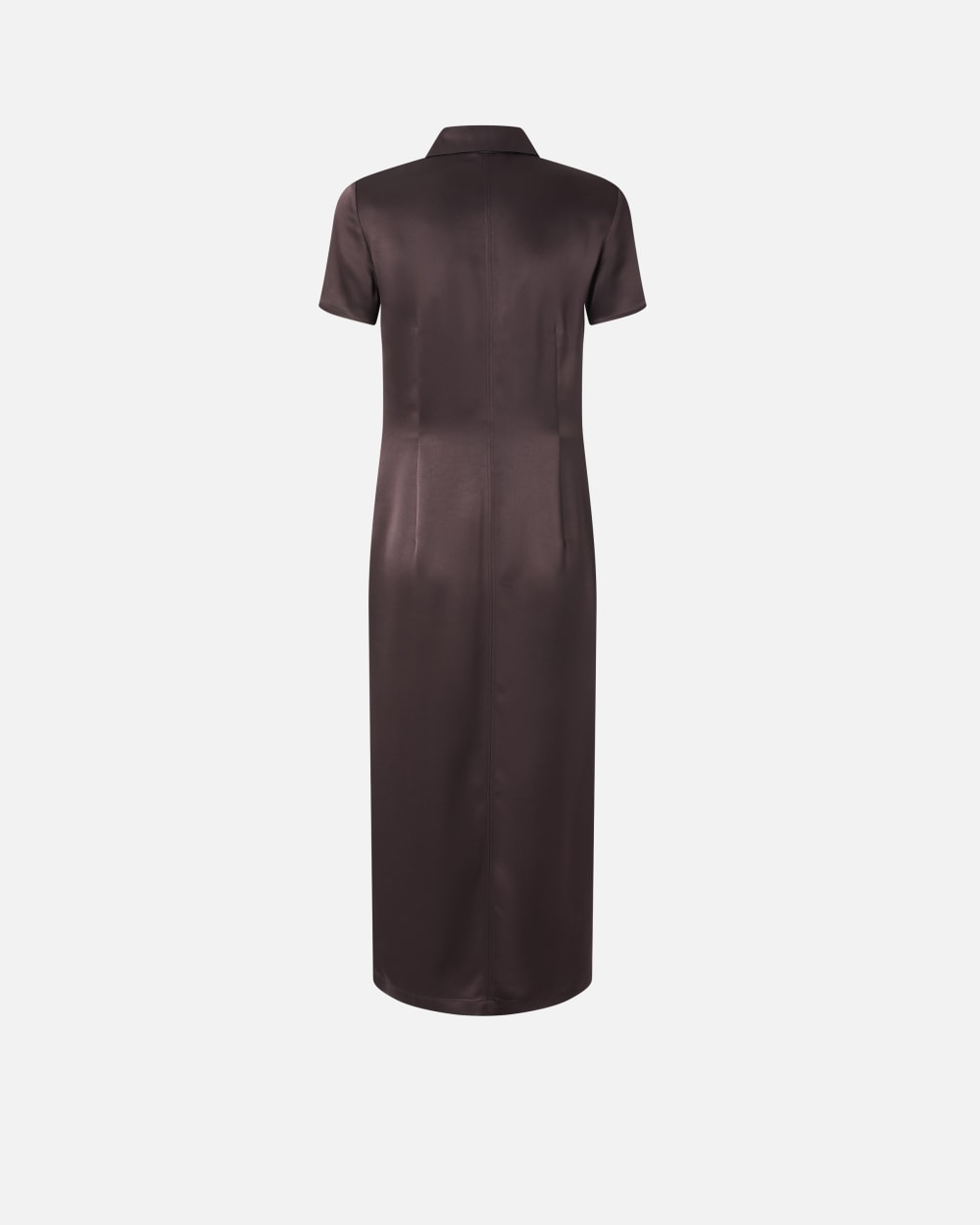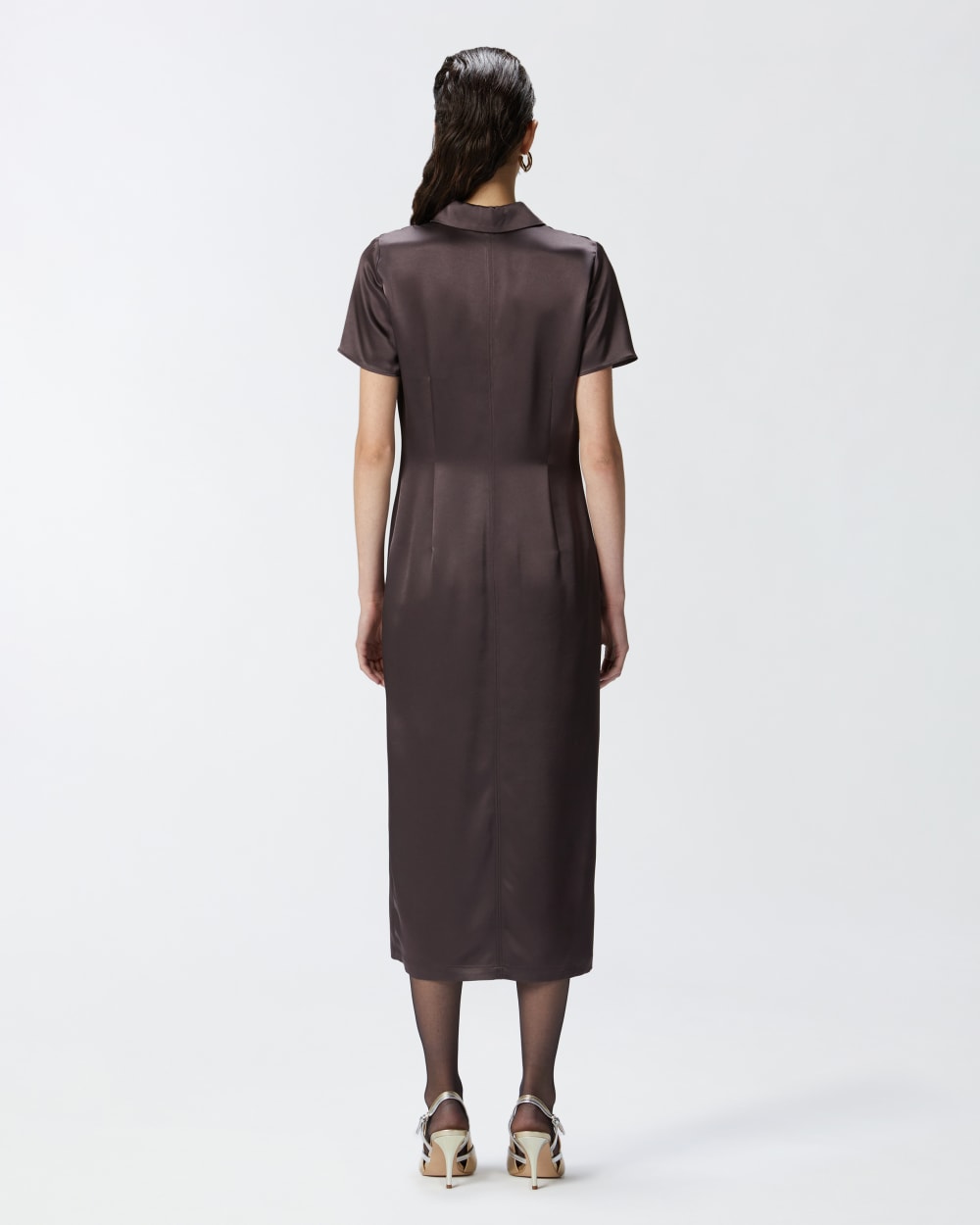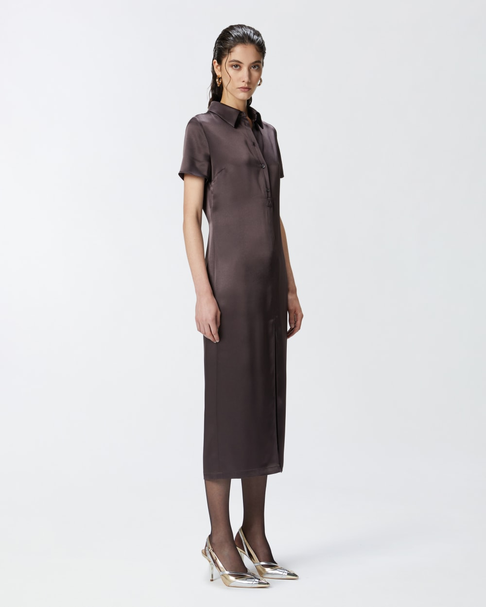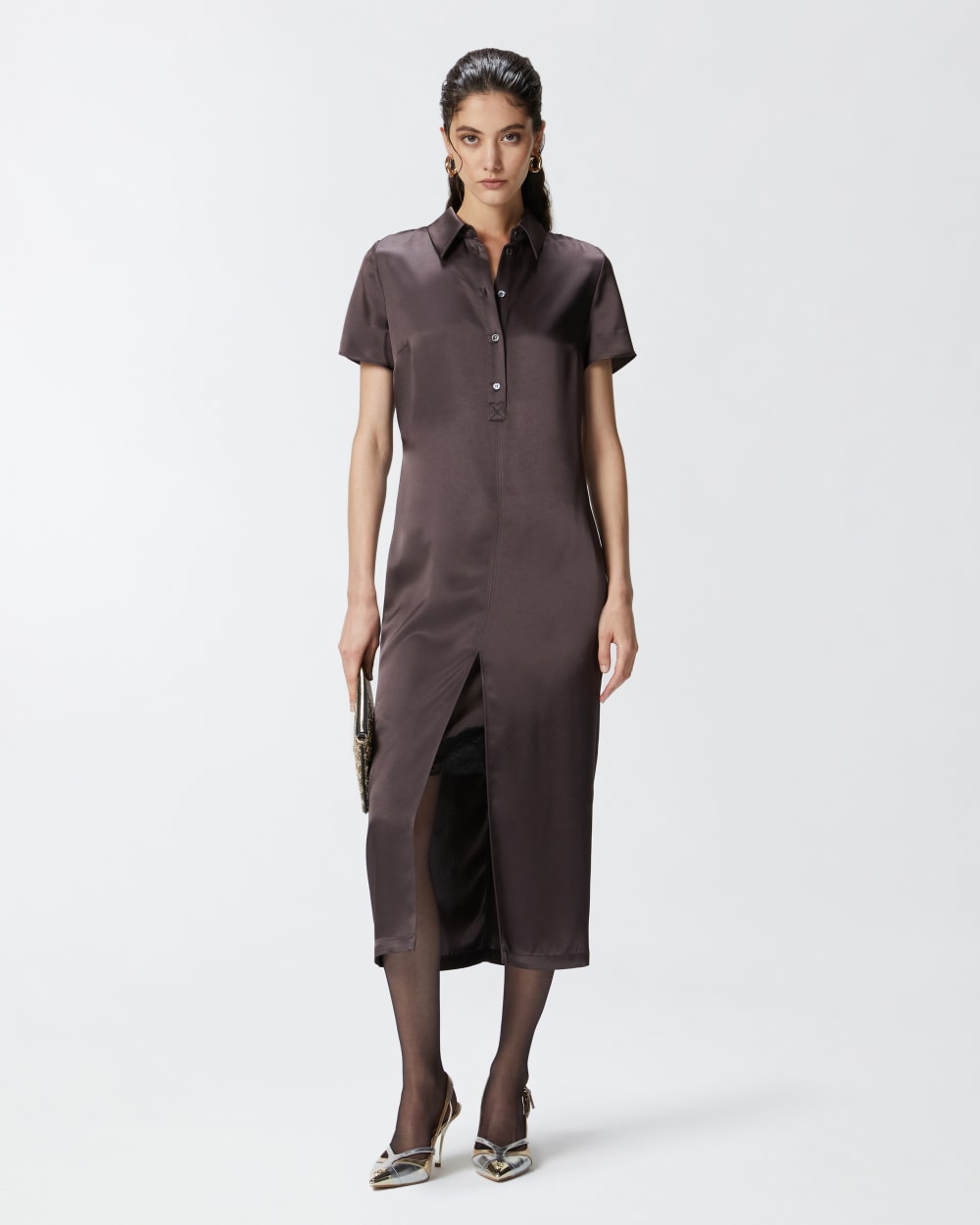 Abito dalla lunghezza midi in leggero e lucido tessuto satin lavato. Silhouette a t-shirt polo, con maniche corte, colletto e abbottonatura davanti. La gonna dalla linea dritta è completata con spacca centrale al fondo davanti, con inserto in pizzo nella parte superiore.