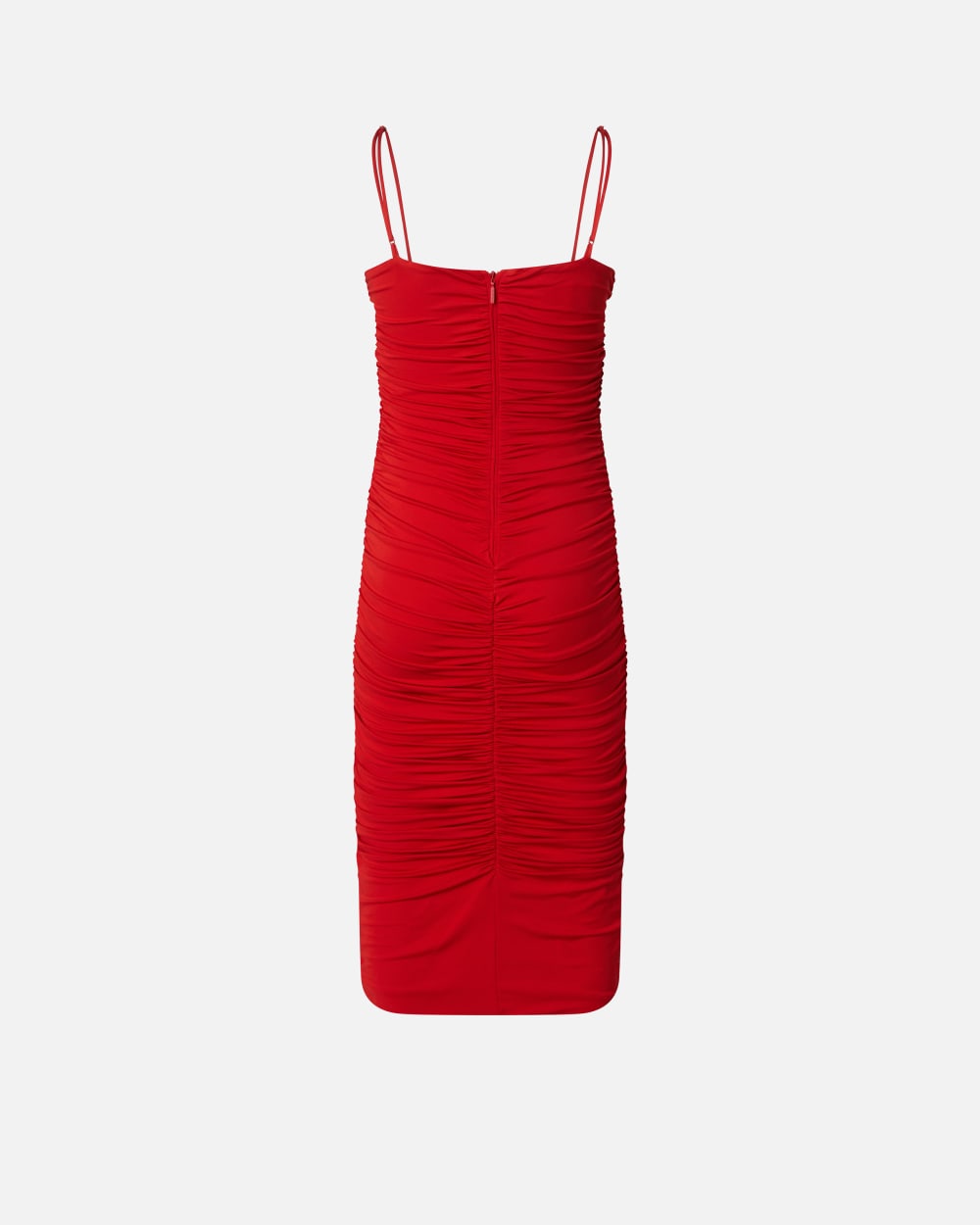 Abito midi senza maniche in tessuto tecnico interlock di viscosa stretch, dalla particolare mano fluida. La silhouette aderente con spalline sottili è completata da scollo dritto e dettagli arricciati sulla lunghezza, sia davanti che sul retro. Spacco centrale al fondo sul retro. Chiusura con zip invisibile nel centro dietro.