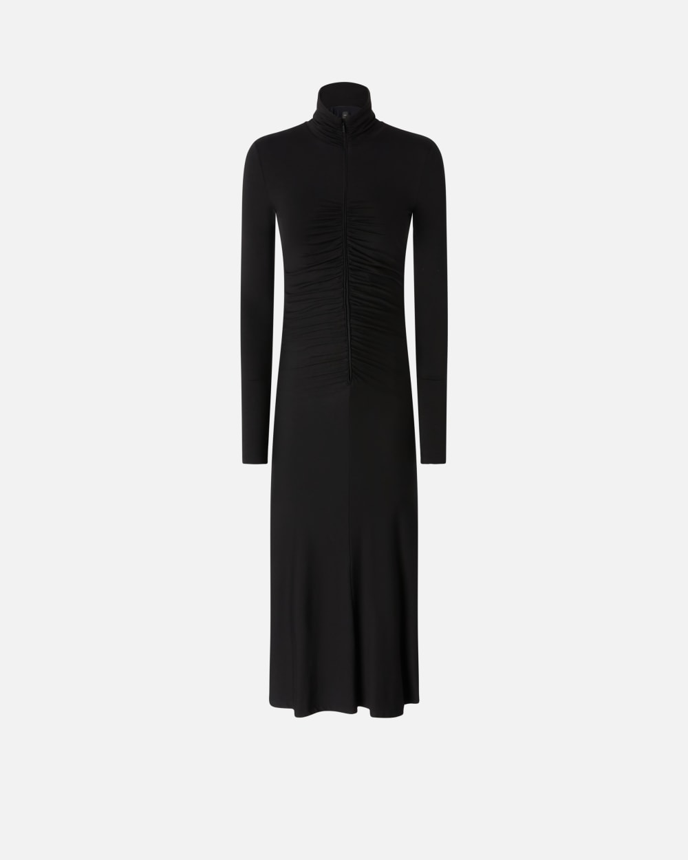 Abito midi, lungo a metà polpaccio, realizzato in morbido jersey modal stretch dalla particolare mano calda che risulta piacevole al tatto e sulla pelle. La silhouette aderente dell’abito, completata da colletto alto e maniche lunghe, è personalizzata con motivi di arricci e drappeggi sia davanti che sul retro, e da zip invisibile davanti.