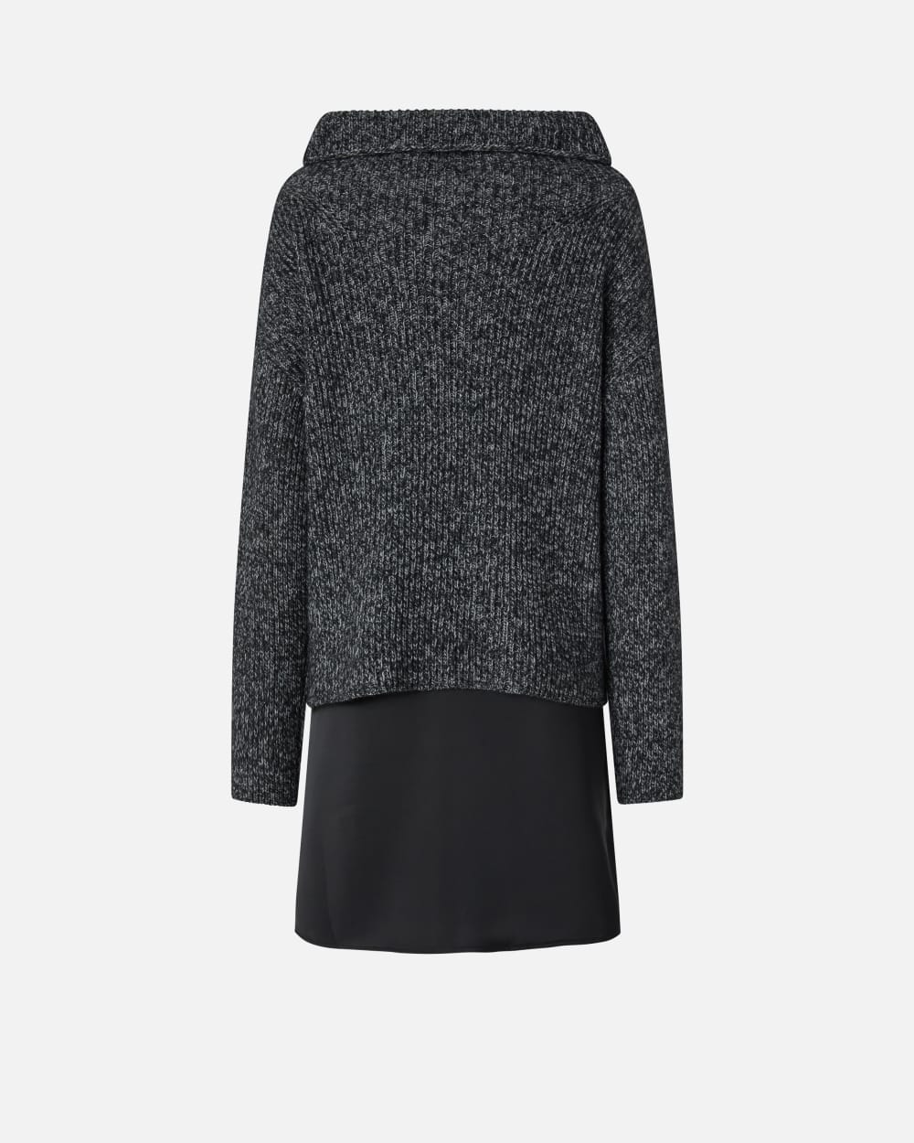 Abito corto bimateriale realizzato con parte superiore in maglia moulinè di misto lana e alpaca, caratterizzata da filato ritorto, lavorata a coste. Il maglione a maniche lunghe con collo a cratere è completato da spacco asimmetrico al fondo e fodera abbinata in tessuto lucido, che crea l’effetto dell’abito. Un outfit originale da giorno, perfetto da indossare per tutte le occasioni.