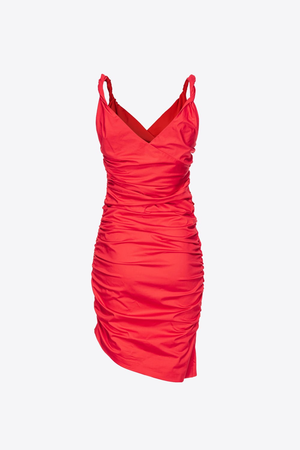 Abito corto senza maniche in raso tecnico leggero. Linea aderente e arricciata, con spalline sottili torchon e scollo a V incrociato, sia davanti che sul retro. Fondo capo con orlo asimmetrico, più lungo da un lato.