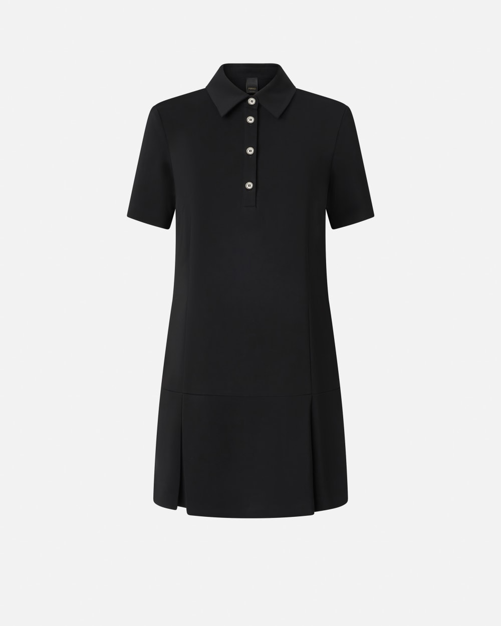 Abito corto da donna realizzato in cady, uno speciale tessuto tecnico particolarmente resistente alle pieghe. Il vestitino è caratterizzato da colletto a polo, con abbottonatura completata con bottoni in metallo, maniche corte e gonna corta con doppia piega sia davanti che sul retro. La linea aderente dell’abito include tasche inserite sui fianchi. L’ispirazione tennis di questo capo sa aggiungere un tocco sporty-chic ai tuoi look da giorno.