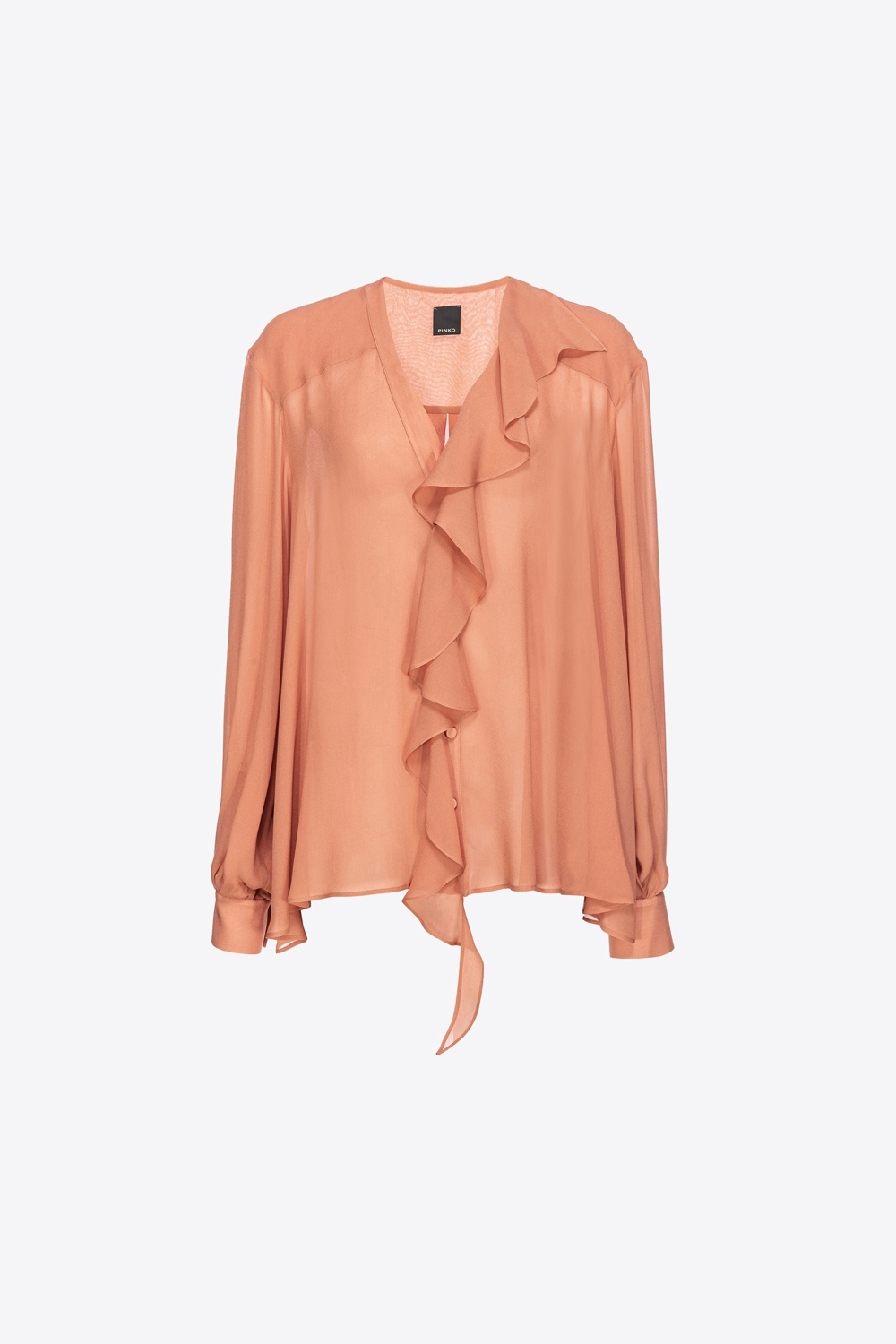 Blusa fluida in leggera georgette di viscosa. Lo scollo a V è completato da rouche che segue l’abbottonatura in tutta la lunghezza, fino a fondo capo. Maniche lunghe a giro leggermente basso con polsino al fondo e chiusura con piccoli bottoni davanti.