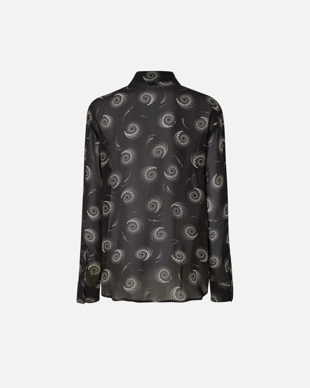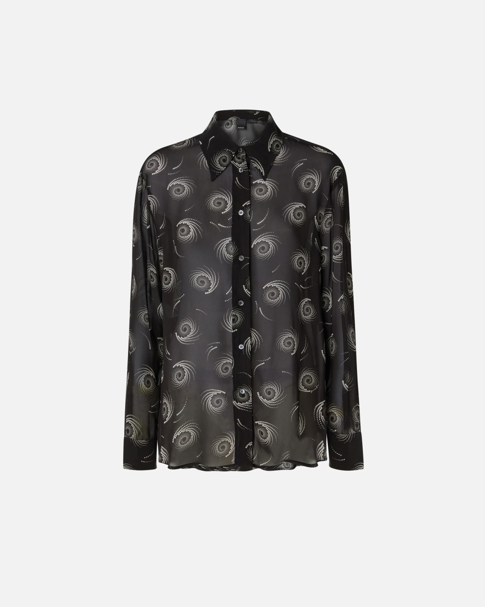 Camicia dalla linea fluida, realizzata in leggera georgette, caratterizzata da una stampa vortici che aggiunge un tocco di originalità. Il tessuto trasparente e leggero garantisce comfort e un’eleganza senza tempo, rendendola ideale per ogni occasione. Il design presenta un elegante colletto classico, maniche lunghe con polsini abbottonati e una chiusura frontale con bottoni.