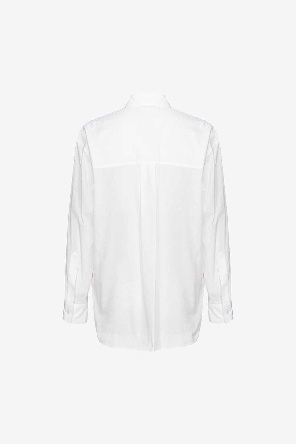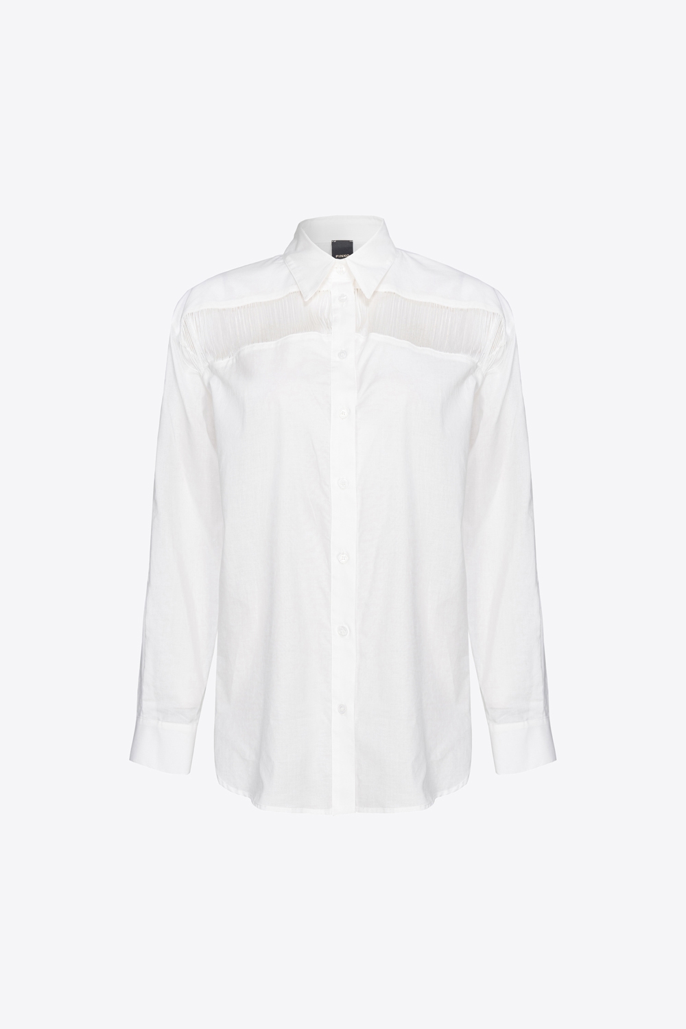 Camicia classica in mussola di cotone con dettaglio di frange applicate davanti, in trasparenza. Colletto classico, maniche lunghe a giro leggermente basso con polsino al fondo e chiusura con bottoni davanti.
