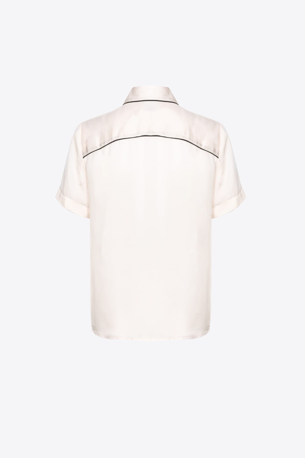 Camicia a mezze maniche in satin di viscosa e cotone caratterizzata da ricamo di ispirazione rodeo sulle spalle. Colletto classico e sprone profilati da piping a contrasto. Chiusura con bottoni a pressione effetto madreperla davanti.