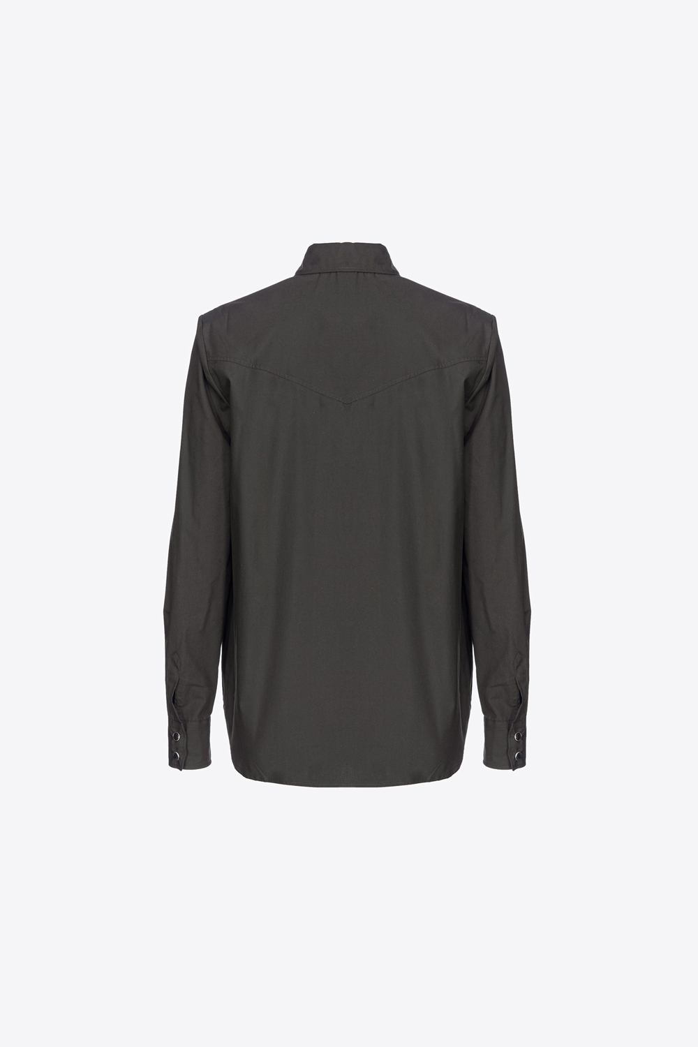 Camicia in popeline di cotone caratterizzata da sprone a punta, stile rodeo, sul retro e a doppia punta davanti, dove simula la patta dei taschini. Colletto classico, maniche lunghe con polsino al fondo e chiusura con bottoni a pressione davanti.