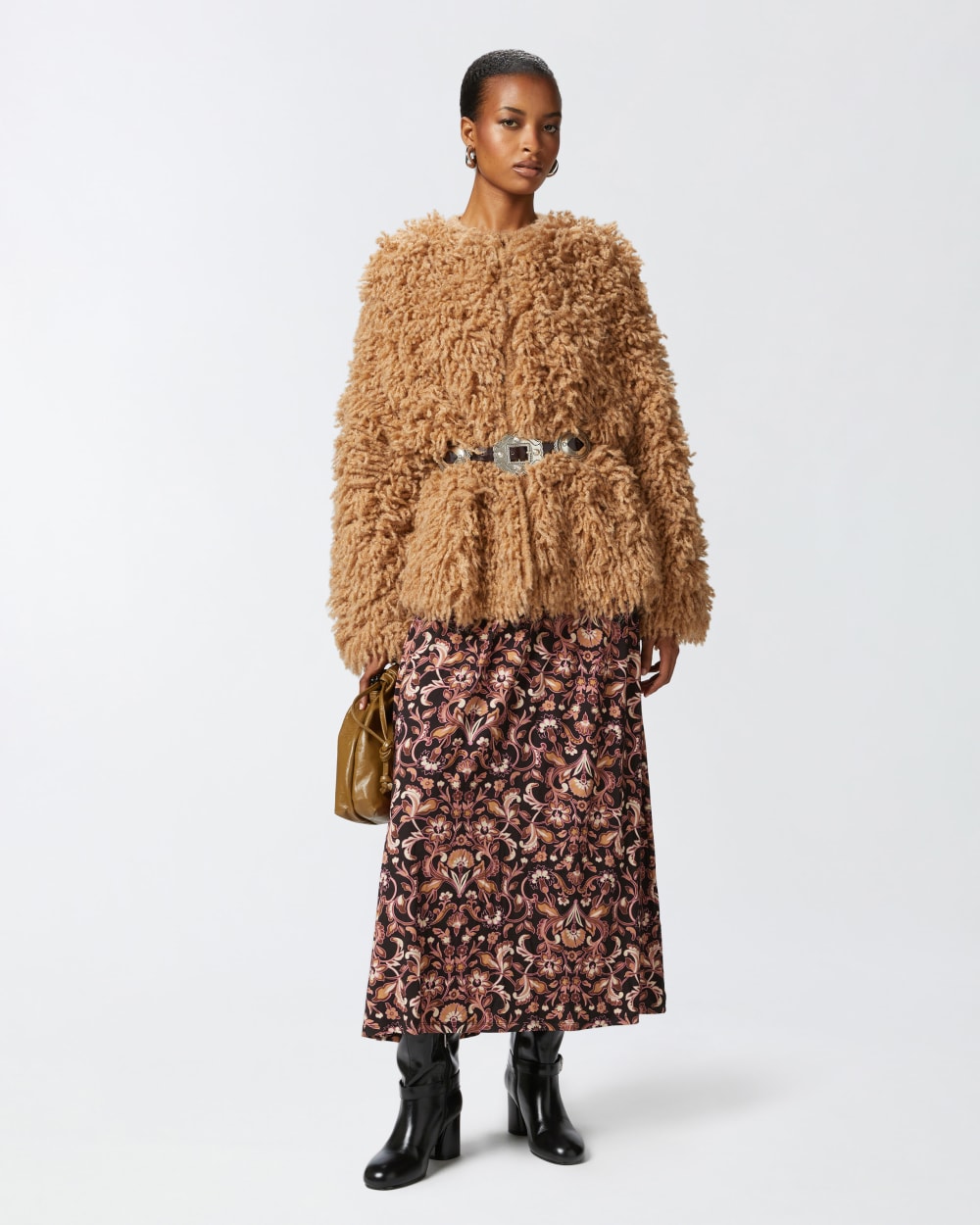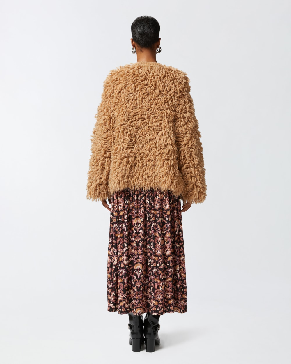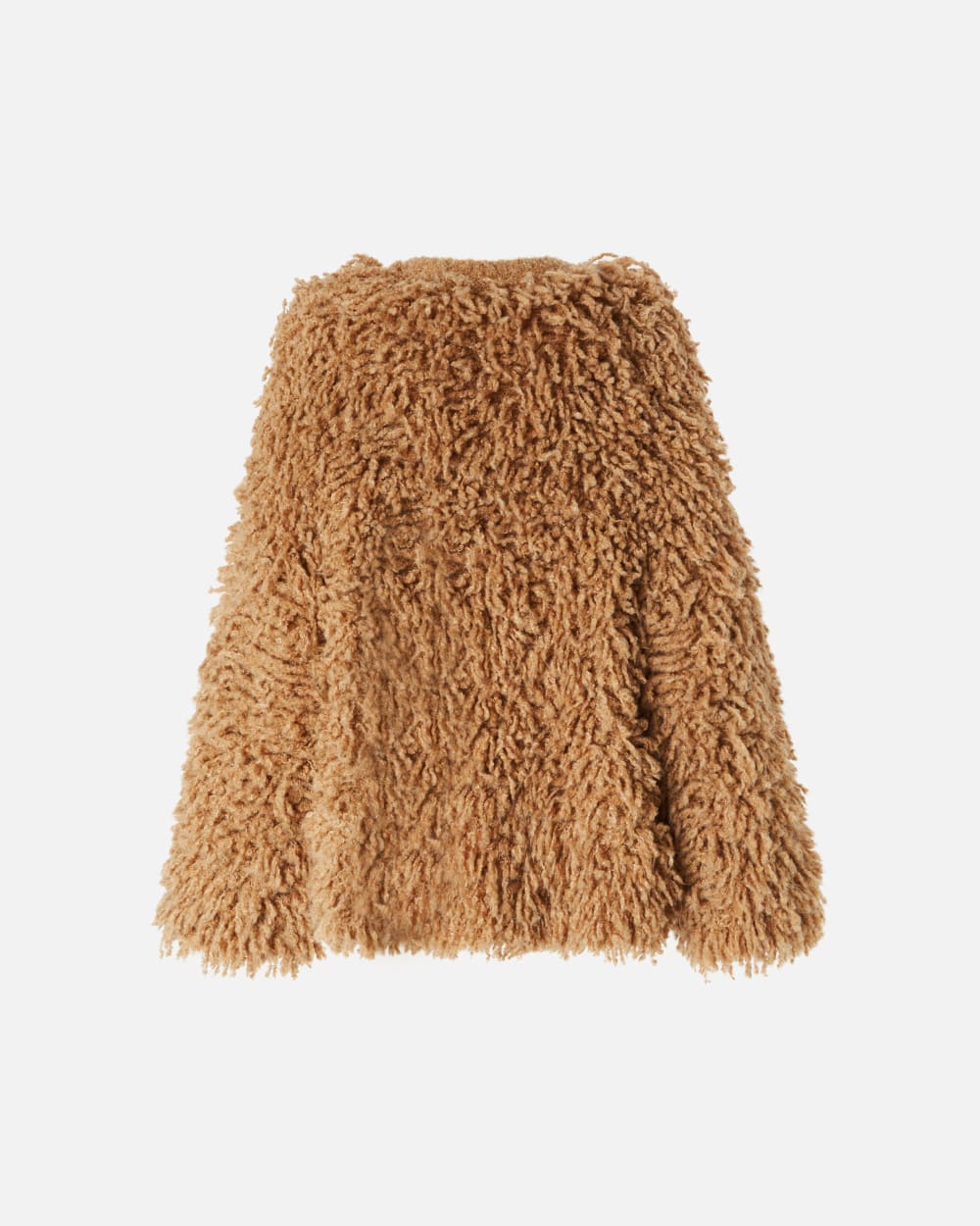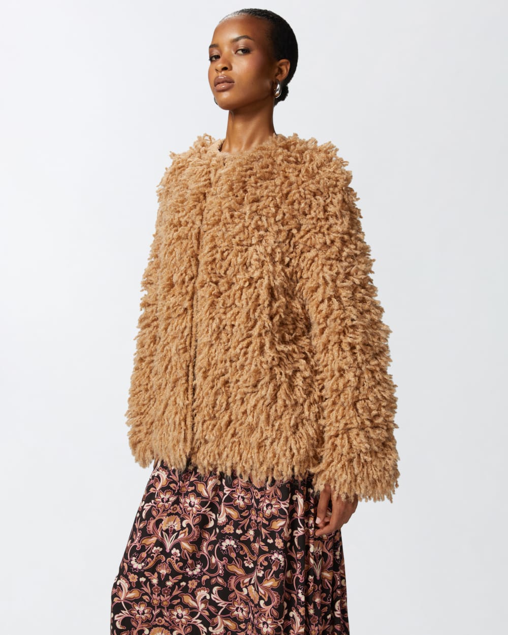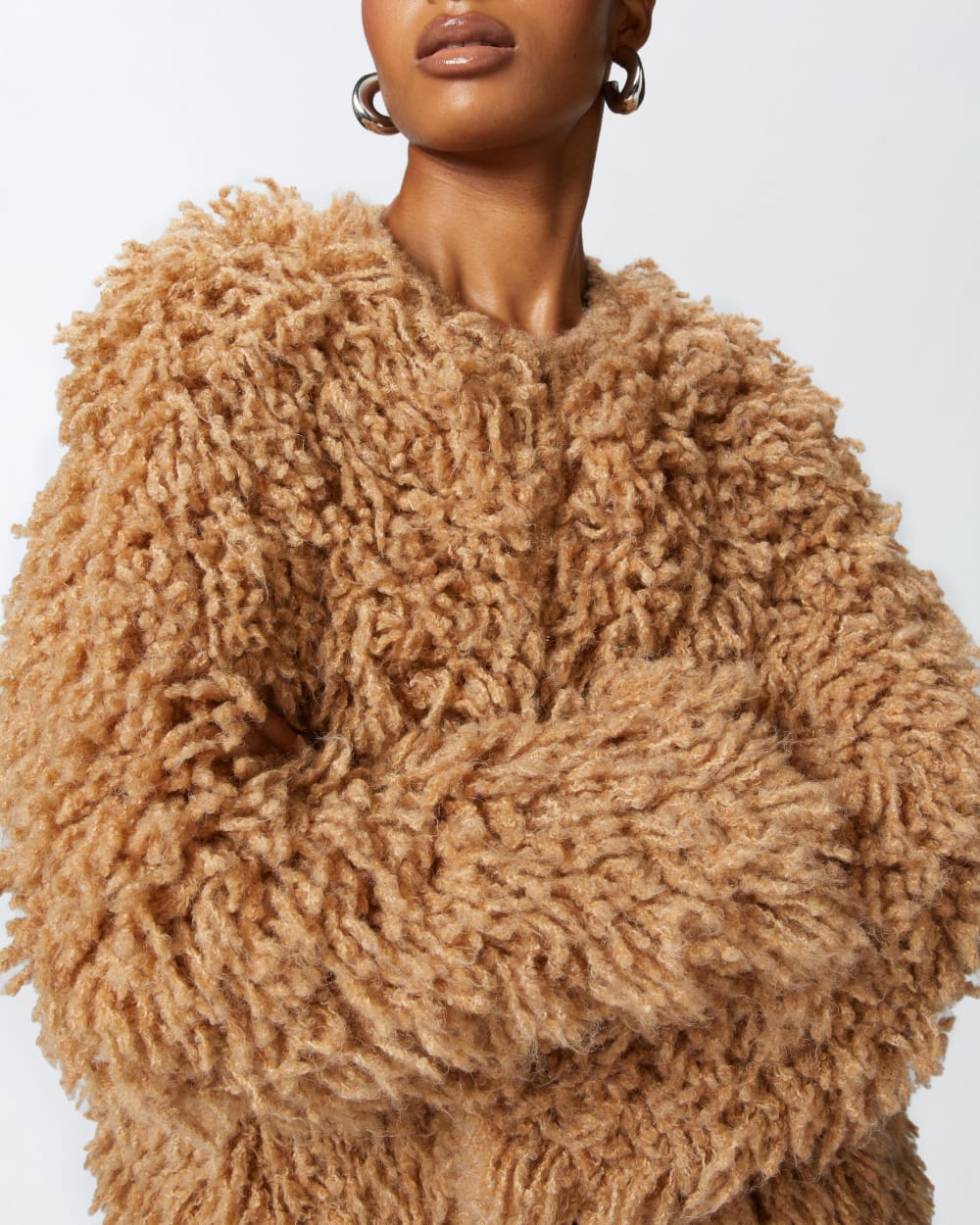 Cappotto in faux fur di misto lana effetto pelliccia. Volume leggermente oversize, con scollo tondo e maniche lunghe. Chiusura con piccoli ganci nascosti davanti.