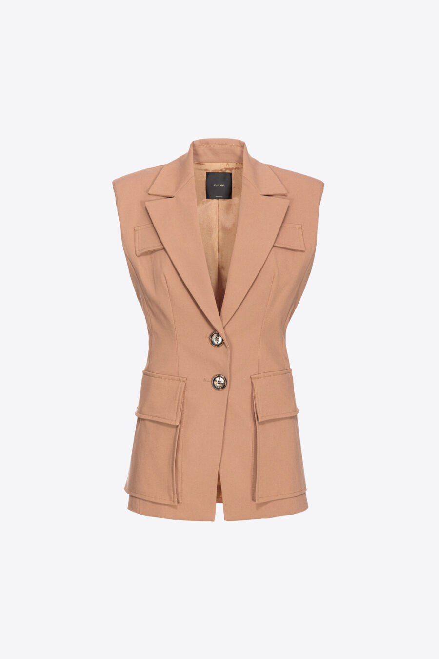 Blazer smanicato, stile gilet, in tricotina di cotone stretch, uno speciale tessuto dalla texture che somiglia alla maglia. Linea aderente con collo a rever, taschini con patta e maxi tasche applicate con patta sui fianchi. Foderato. Chiusura monopetto con doppio bottone gioiello.