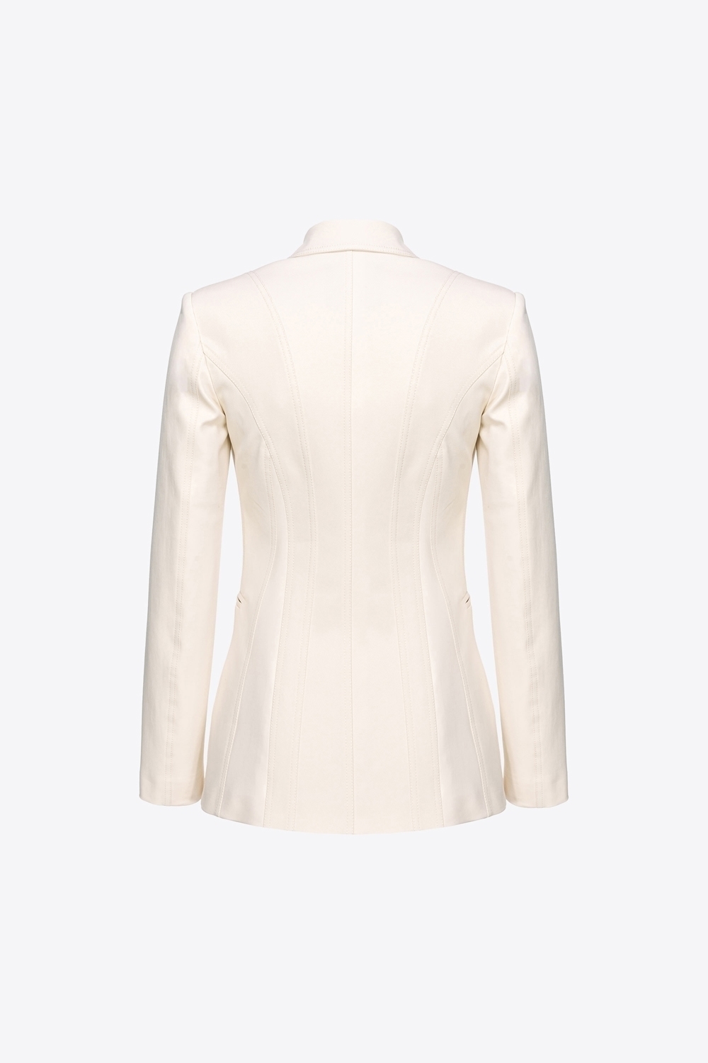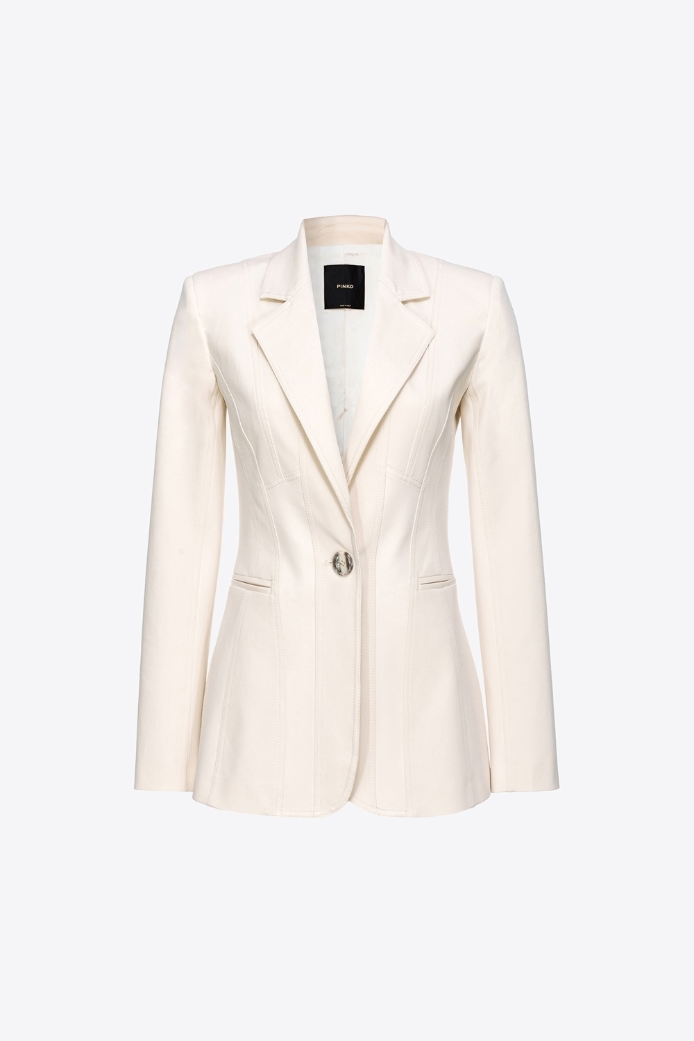 Blazer dalla linea leggermente sfiancata in tricotina di cotone stretch, uno speciale tessuto dalla texture che somiglia alla maglia, con dettagli in tessuto tecnico di viscosa stretch lavorato a punto stoffa effetto scuba. Collo a rever, maniche lunghe e tasche a filetto sui fianchi. Le impunture che caratterizzano il blazer ne enfatizzano la silhouette, valorizzandone le linee. Foderato. Chiusura monopetto con bottone singolo.