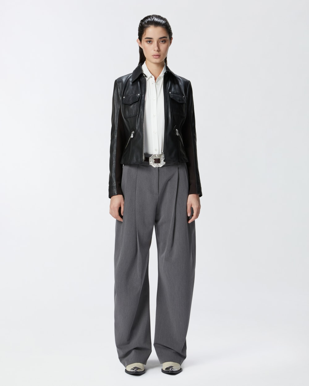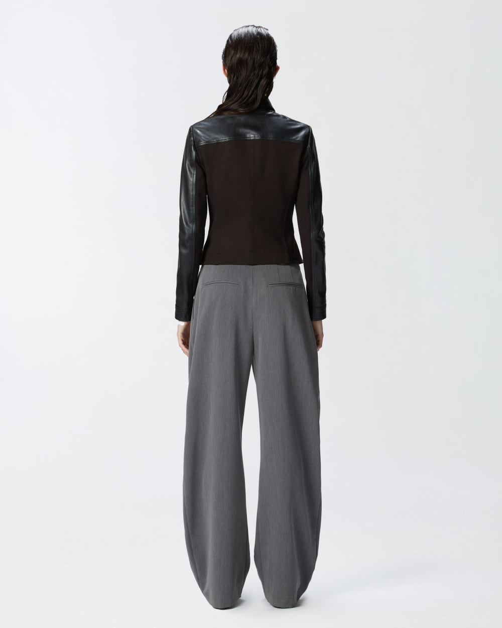 Giacca biker dal taglio corto in morbida pelle dalla texture liscia con parte posteriore del capo e inferiore delle maniche lunghe realizzata in tessuto tecnico di viscosa stretch. La linea aderente è completata con colletto a punta, taschini applicati con patta a punta e tasche oblique sui fianchi, chiuse con zip. La giacca “chiodo” è foderata in tessuto ed è chiusa con zip metallica con doppio cursore.