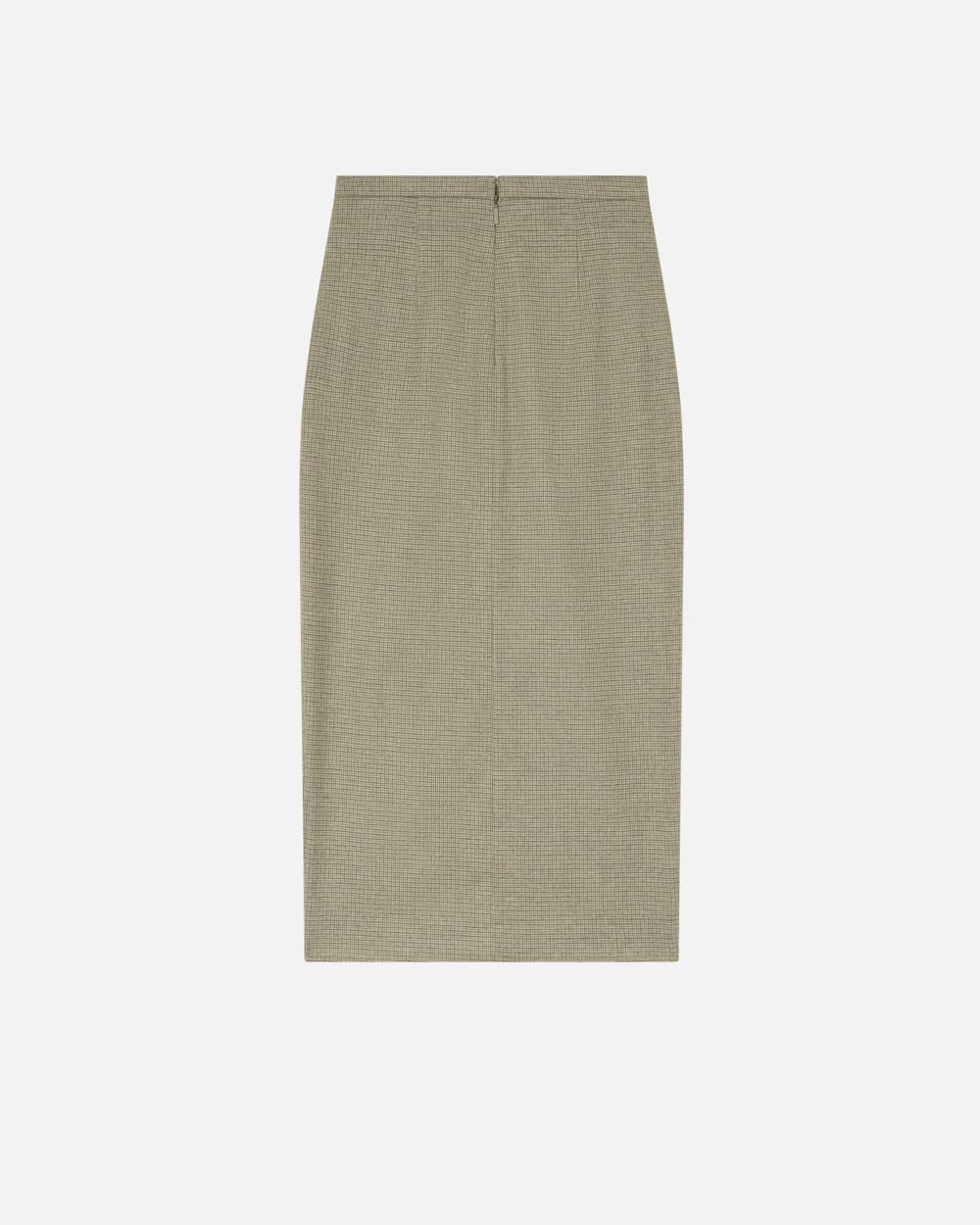Gonna midi, lunga circa a metà polpaccio, in flanella di misto lana stretch con disegno micro quadretti all-over. Il taglio sartoriale della gonna è reso ancora più elegante dalla vita alta, completata con tasche alla francese sui fianchi e spacco profondo centrale davanti. La chiusura con zip invisibile nel centro dietro mantiene la linea della gonna pulita ed essenziale.