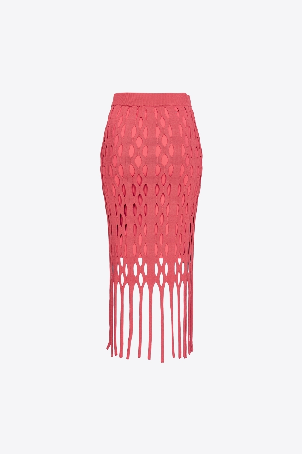 Gonna longuette dalla linea aderente in maglia effetto rete con frange al fondo. Foderata in tessuto stretch e vita con elastico.