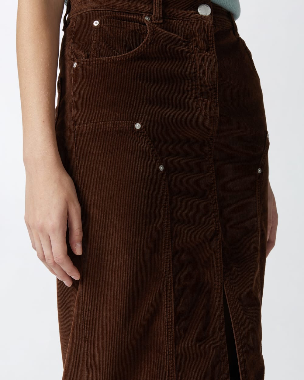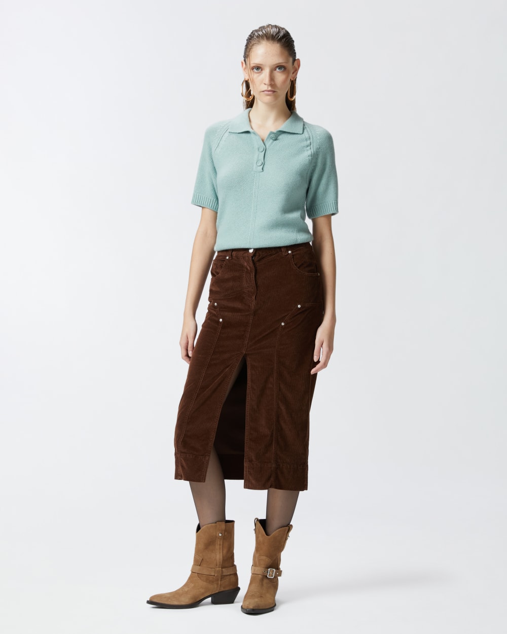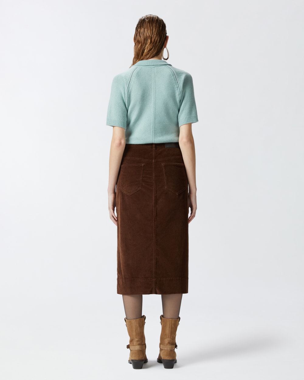 Gonna cinque tasche dalla linea dritta in morbido velluto di misto modal e cotone stretch dalla lavorazione “millerighe”, a costine molto sottili. Lunghezza midi, con passanti per cintura in vita, spacco centrale al fondo e dettagli di impunture e rivetti di ispirazione workwear davanti. Chiusura con zip e bottone a chiodo in metallo.