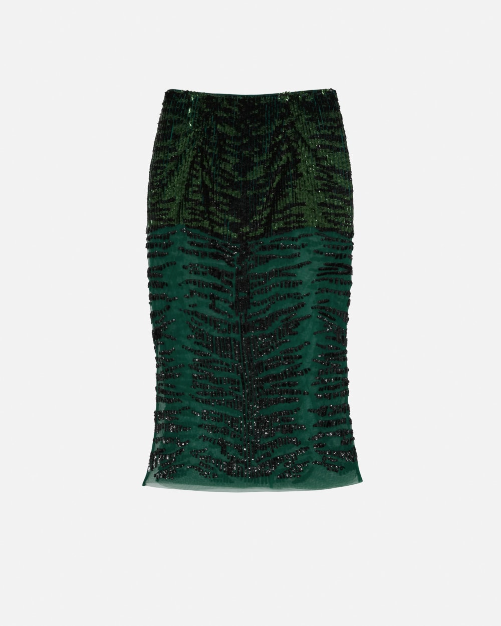 Gonna longuette, a metà polpaccio, in leggero tulle con ricamo animalier zebra realizzato con paillettes cuvettes. Il ricamo ha un disegno fitto e coprente nella parte superiore della gonna, diradandosi man mano che si va a fondo capo, lasciando intravedere il tulle in trasparenza.