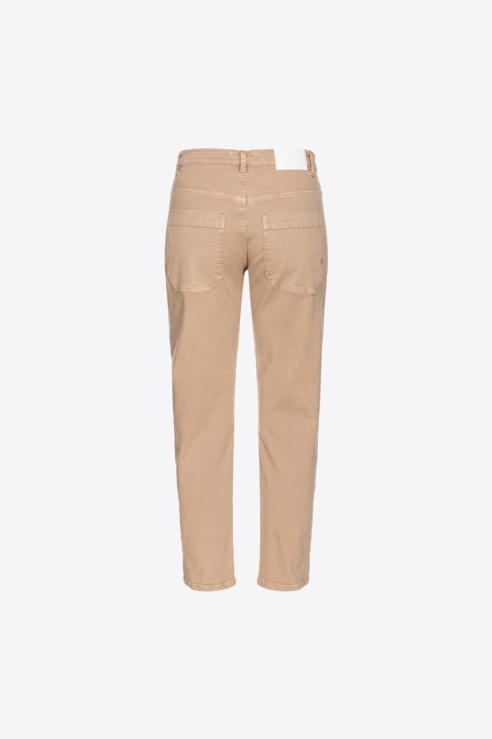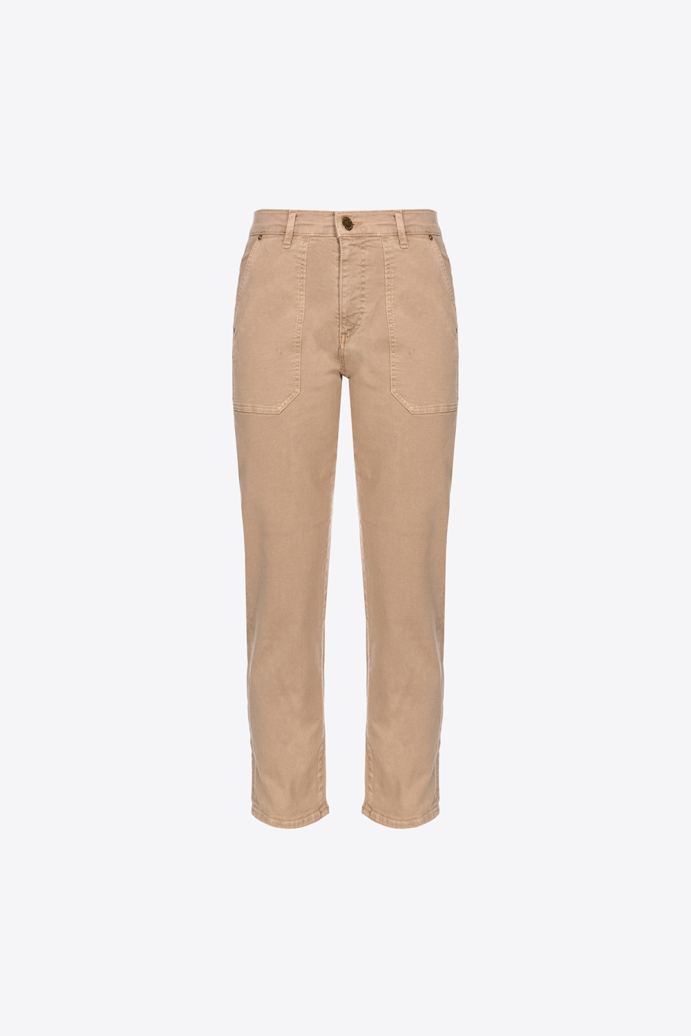 Pantaloni dalla silhouette chinos in bull di cotone stretch. Vita regular con passanti per cintura con maxi tasche applicate davanti e tasche a toppa sul retro. Gamba dalla linea dritta, leggermente più morbida nella parte alta. Chiusura con zip e bottone a chiodo in metallo.