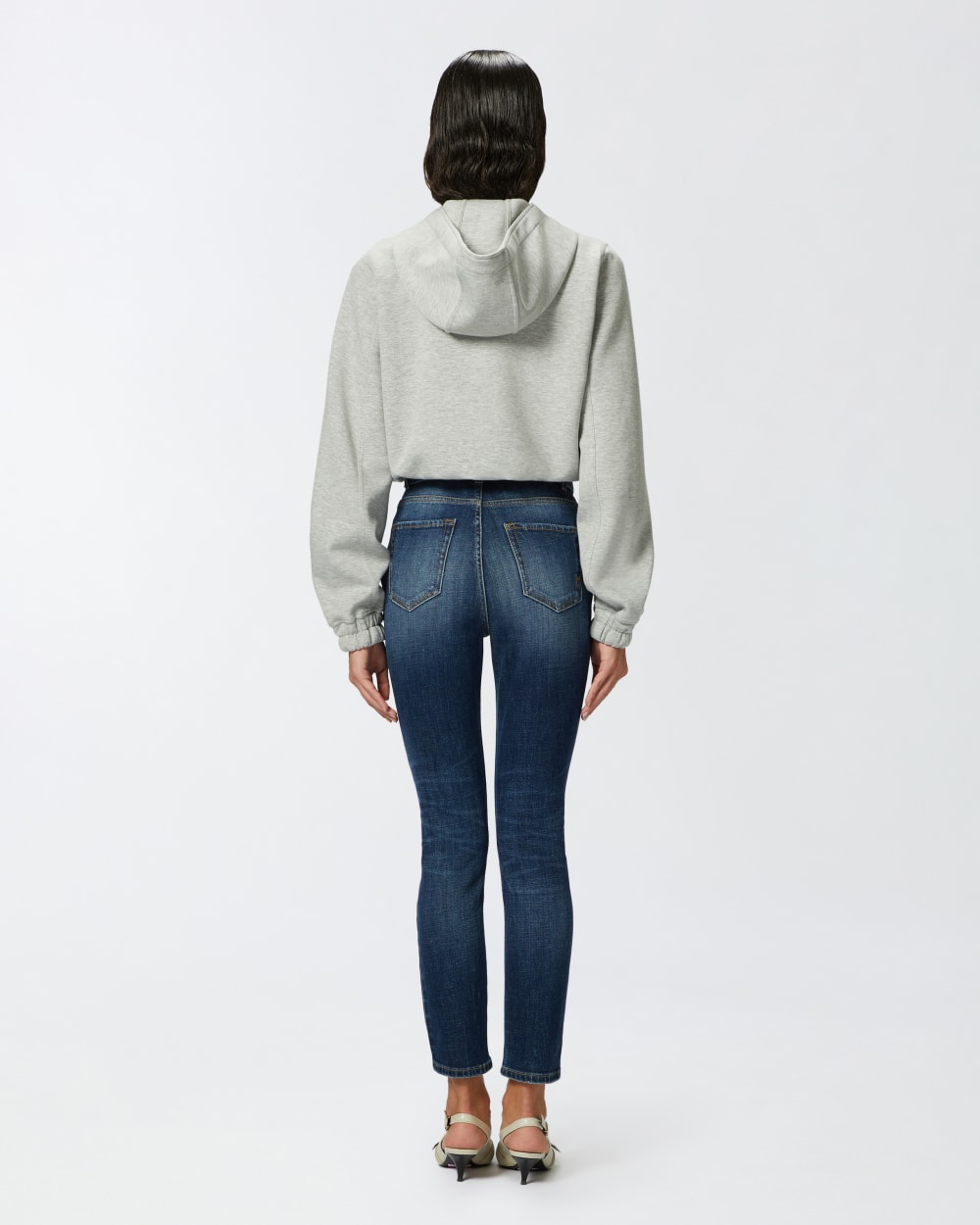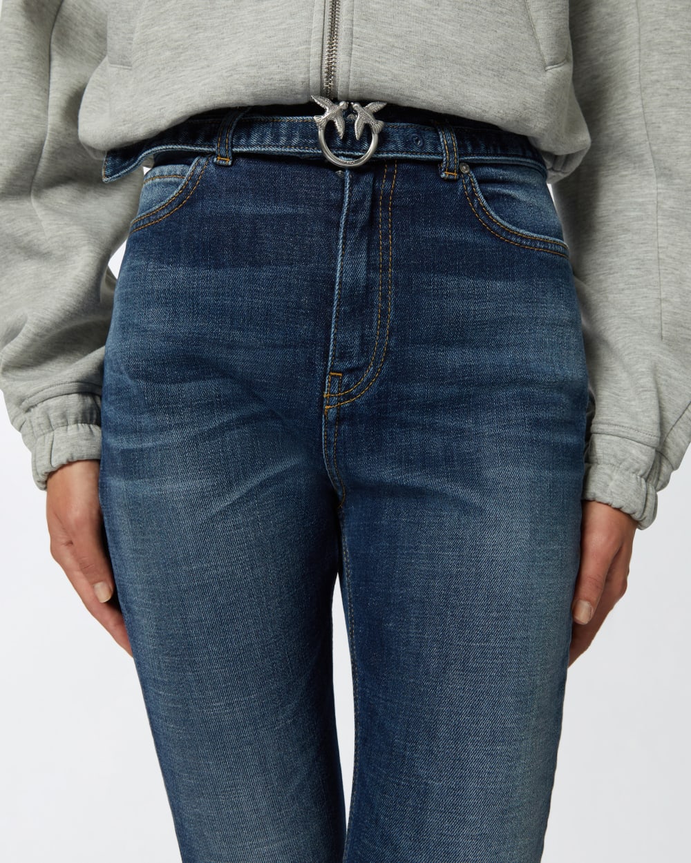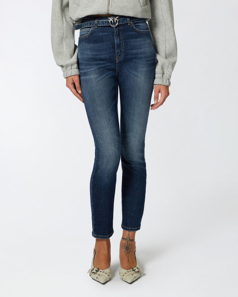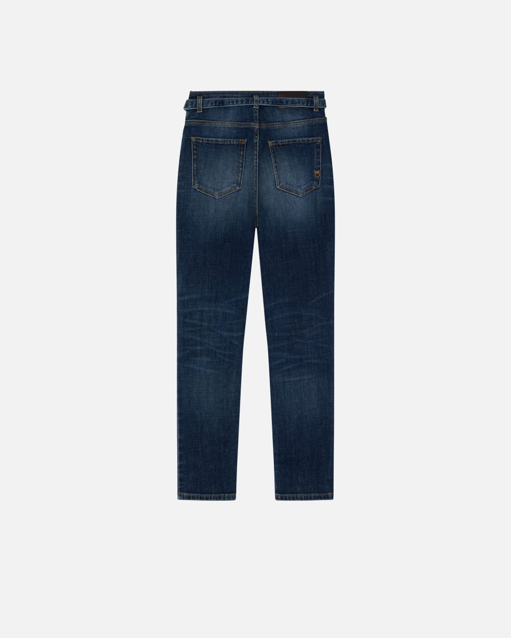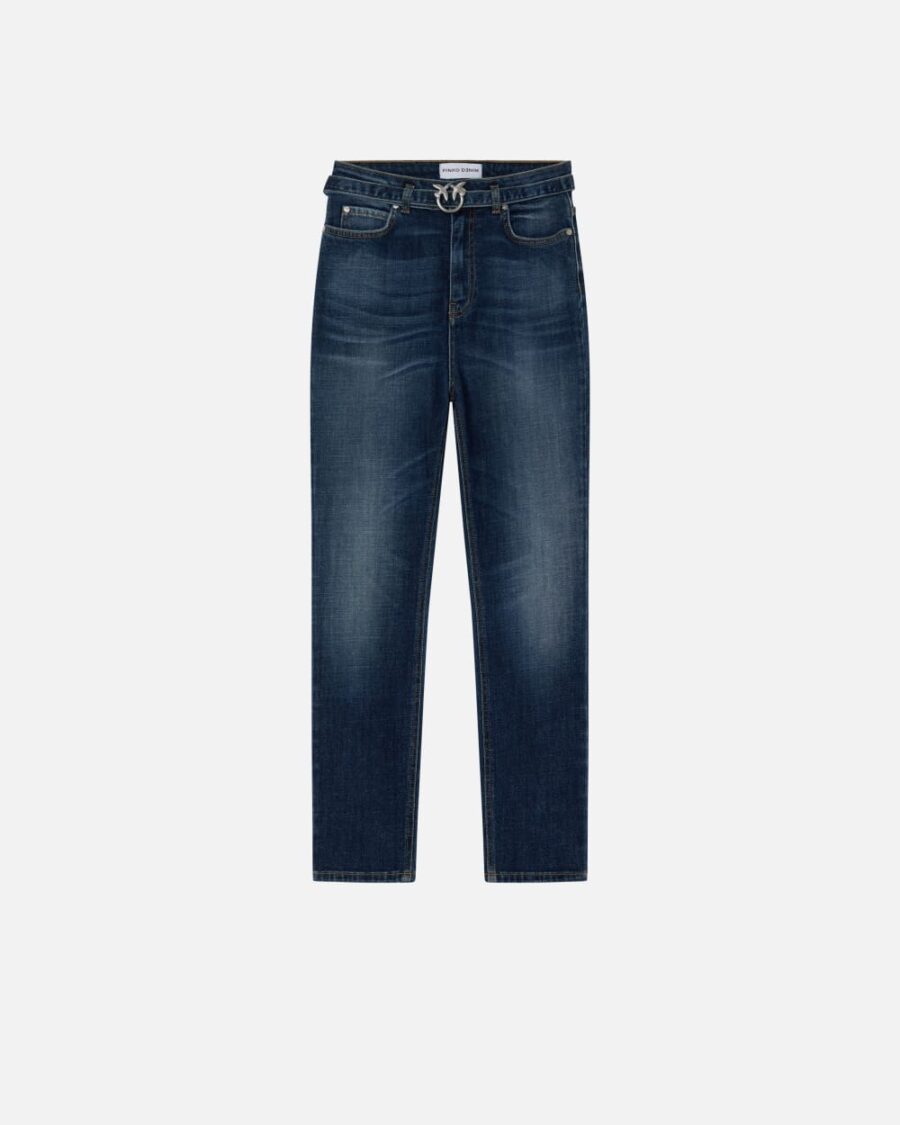 Jeans cinque tasche da donna dalla linea aderente skinny-fit in denim comfort, leggermente elasticizzato, lavaggio vintage blu scuro. Perfetti alleati dei look di tutti i giorni, questi jeans aderenti a vita alta sono personalizzati con cintura abbinata nello stesso tessuto con mini fibbia Love Birds Diamond Cut in metallo. Chiusura con zip e bottone a chiodo in metallo.