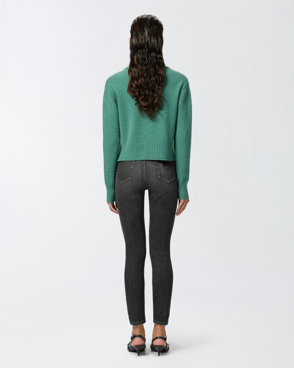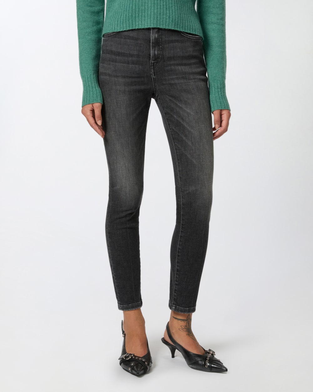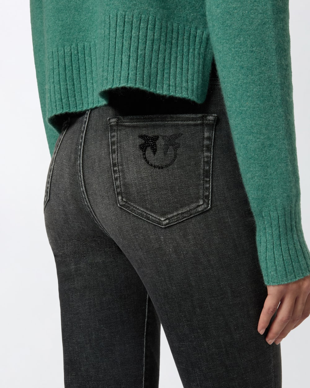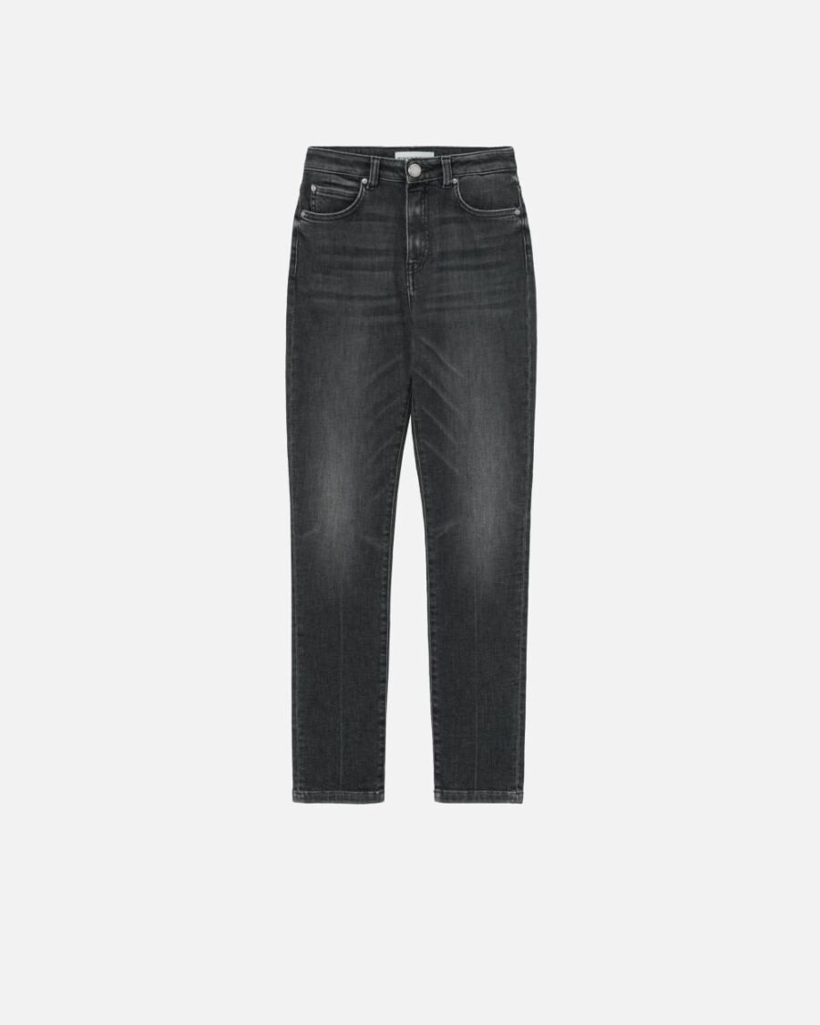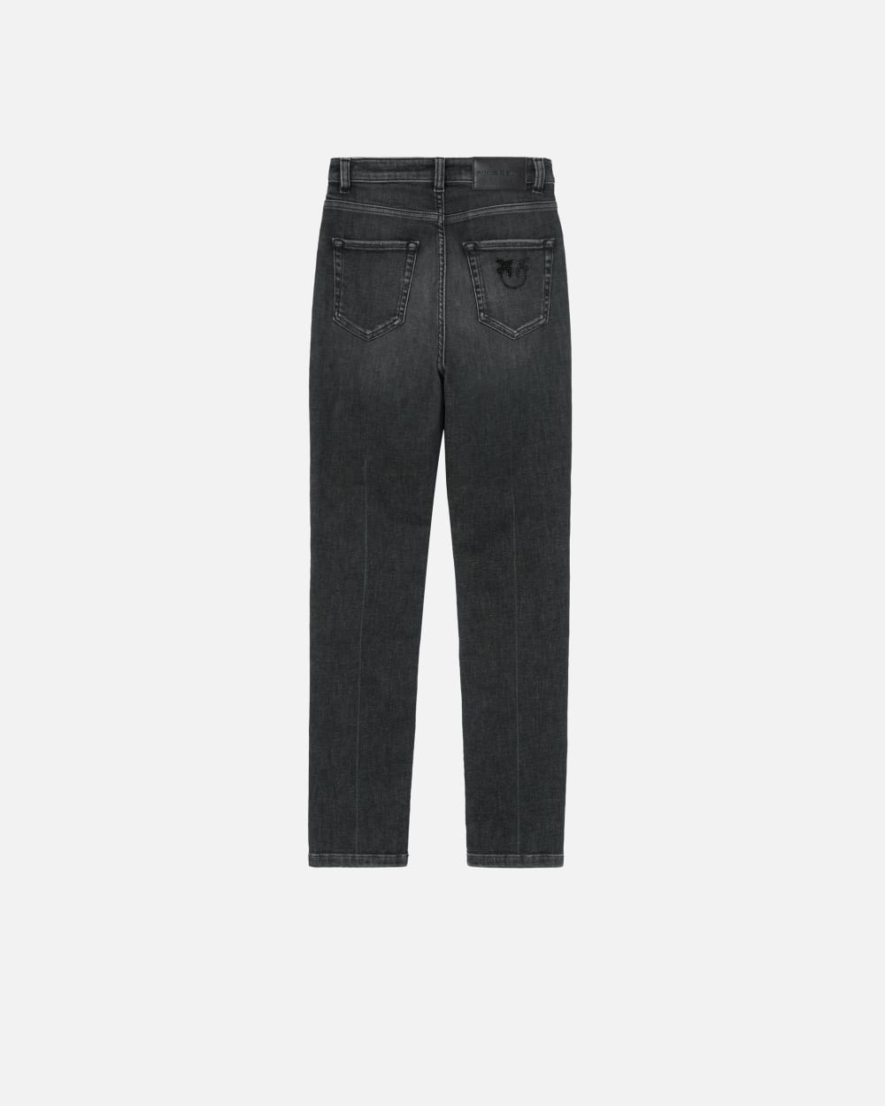 Jeans cinque tasche dalla silhouette aderente in denim vintage grigio scuro. Vita alta completata da passanti per cintura e ricamo Love Birds con applicazioni shiny su una delle due tasche posteriori. Chiusura con zip e bottone a chiodo in metallo.