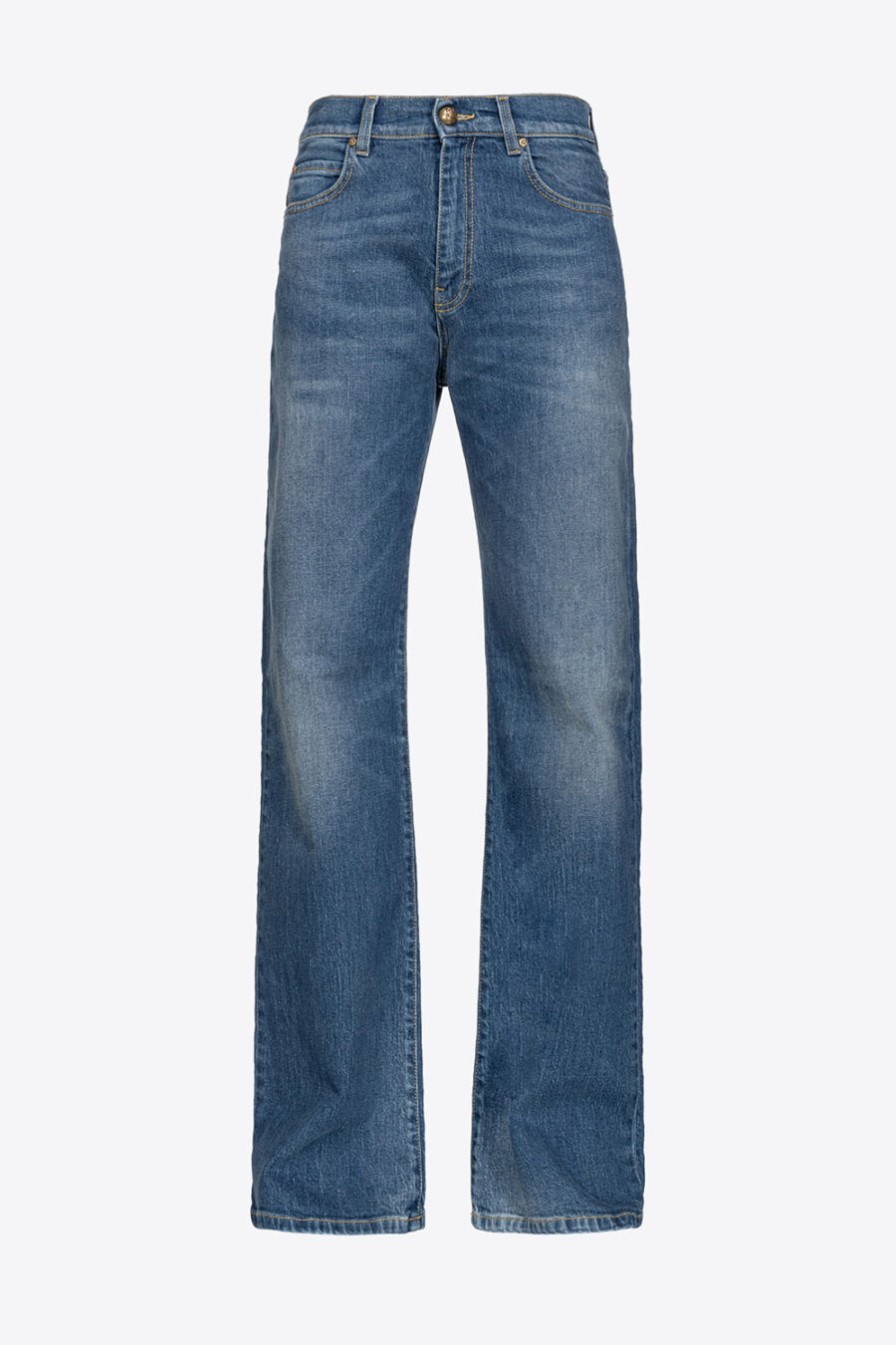 Jeans cinque tasche wide leg in denim comfort blue. Vita bassa con passanti per cintura e gamba dalla linea dritta, ampia e rilassata. Chiusura con zip e bottone a chiodo in metallo.