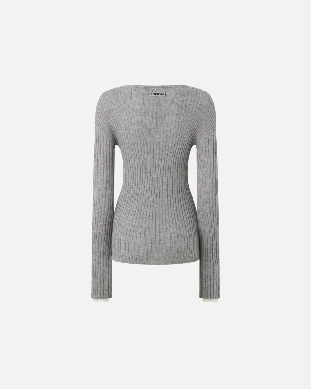 Maglia aderente da giorno a maniche lunghe realizzata in filato di misto lana e cachemire lavorata a costine, caratterizzata da ampio scollo davanti. Le maniche lunghe sono personalizzate con profilo a contrasto di colore che crea un effetto layering, come di due maglie indossate una sopra l’altra. La maglia è personalizzata con etichetta logo PINKO applicata sul retro dello scollo.