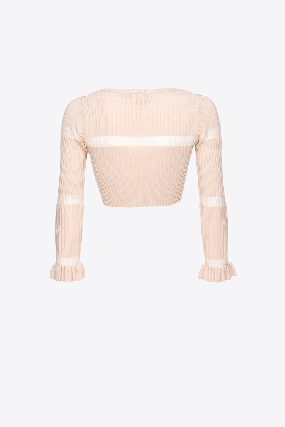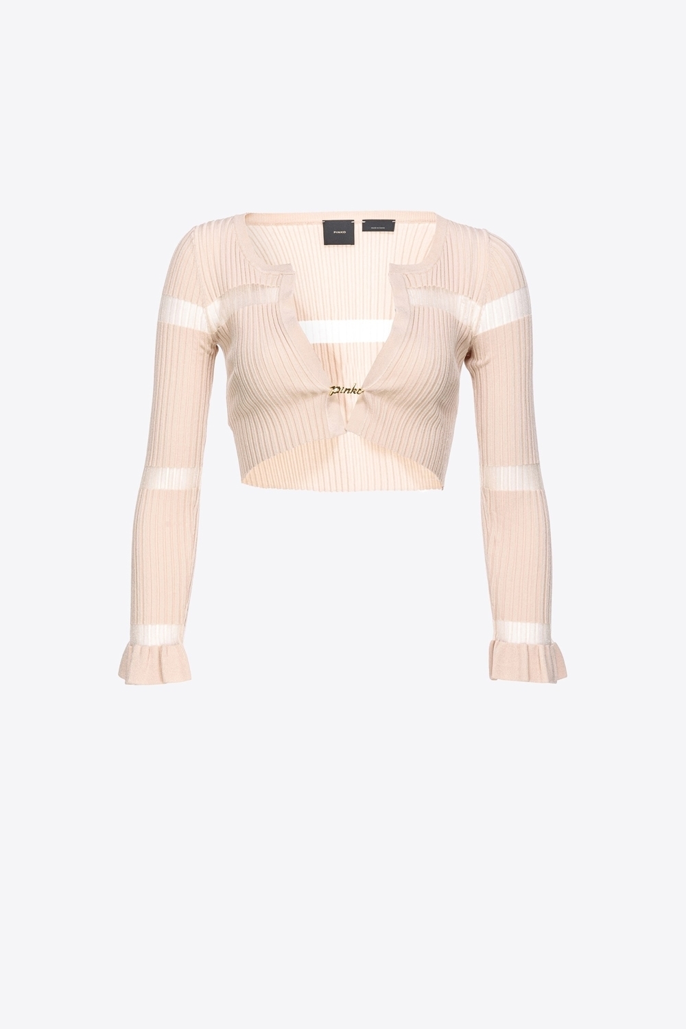 Cardigan corto dalla linea aderente in maglia lavorata a costine in dettaglio di righe intasiate lasciate in trasparenza. Personalizzato con piccolo gancetto in metallo a forma di lettering PINKO in corsivo.