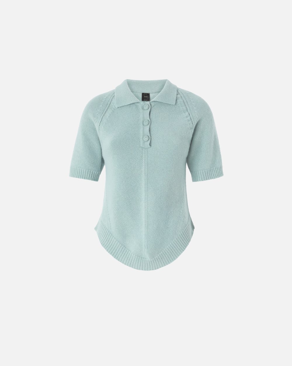 T-shirt polo a maniche corte in maglia di misto lana e fine cachemire, con colletto e abbottonatura davanti, con 3 bottoni in tono colore personalizzati con logo Love Birds. Taglio leggermente corto, con polsini e fondo capo leggermente stondato lavorati a costine.
