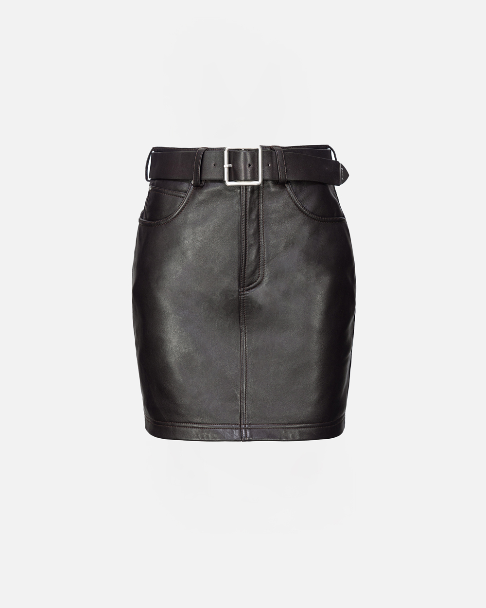 Minigonna cinque tasche dalla linea aderente in nappa con cintura abbinata, nello stesso tessuto, con fibbia di forma squadrata. Foderata in tessuto per un maggio comfort. Chiusura con zip e bottone.