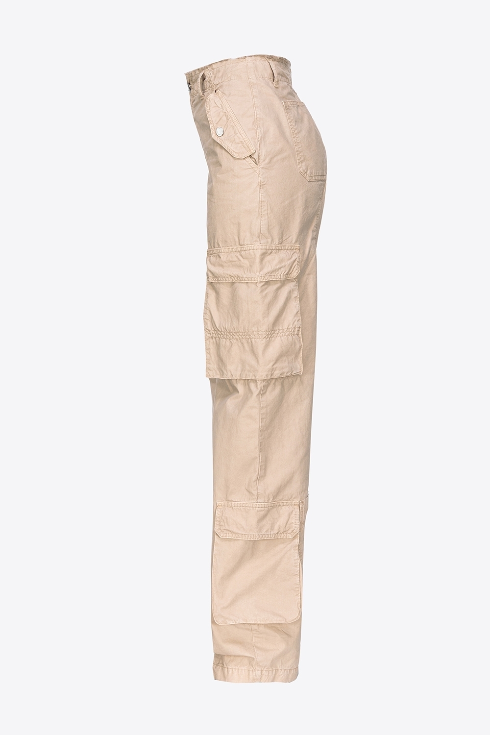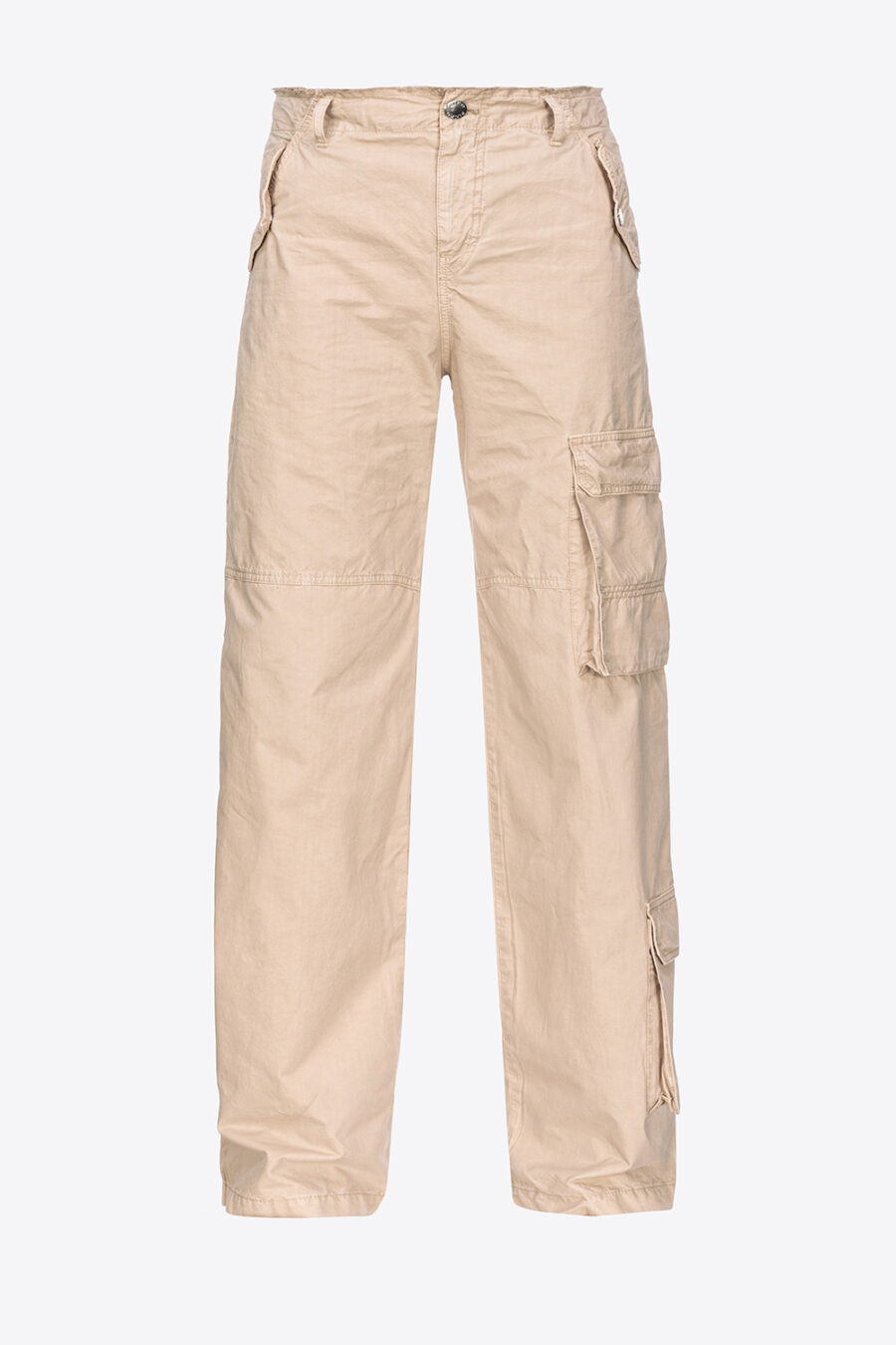 Pantaloni cargo in tela di cotone tinto dal particolare effetto old, quasi invecchiato. Vita regular con passanti per cintura, tasche con patta a punta sui fianchi, tasche a toppa applicate sul retro e maxi tasche laterali a soffietto in stile utility. Chiusura con zip e bottone in metallo.
