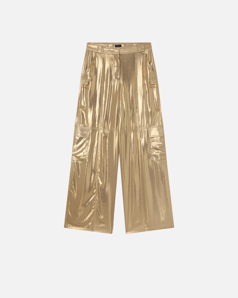 Pantaloni cargo da donna dalla linea wide-leg realizzati in leggera georgette color oro, dalla texture luminosa e scintillante. La silhouette a gamba ampia, con vita regular e cavallo comodo, è completata con tasche alla francese sui fianchi, maxi tasche applicate con patta sui lati e tasche a toppa sul retro con dettagli di fettucce applicate. La linea a palazzo è valorizzata ancor più dallo spacco centrale a fondo gamba davanti, che lascia intravvedere le scarpe che sceglierai di abbinare ai pantaloni. Chiusura con zip e gancio a uomo, nascosto in vita. Abbina i pantaloni con la blusa dorata per creare un total look originale da sfoggiare nelle occasioni dove il dress code ti permette di osare, con eleganza.