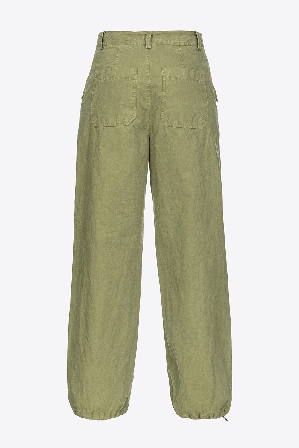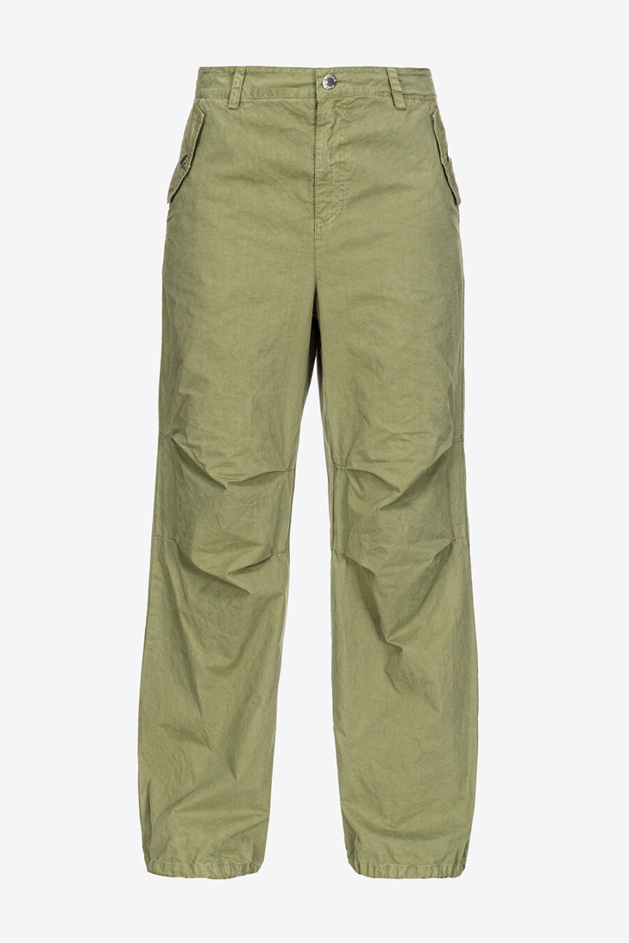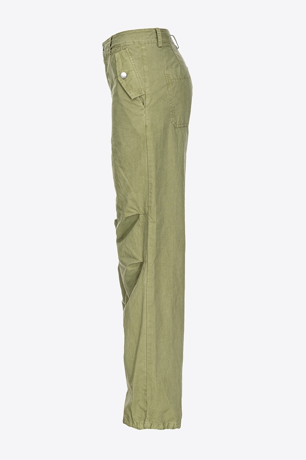 Pantaloni a gamba ampia stile utility in tela di cotone tinto dal particolare effetto old, quasi invecchiato. Vita regular con passanti per cintura, tasche con patta a punta sui fianchi, tasche a toppa applicate sul retro. Dettaglio di coulisse inserita nell’orlo a fondo gamba. Chiusura con zip e bottone in metallo.