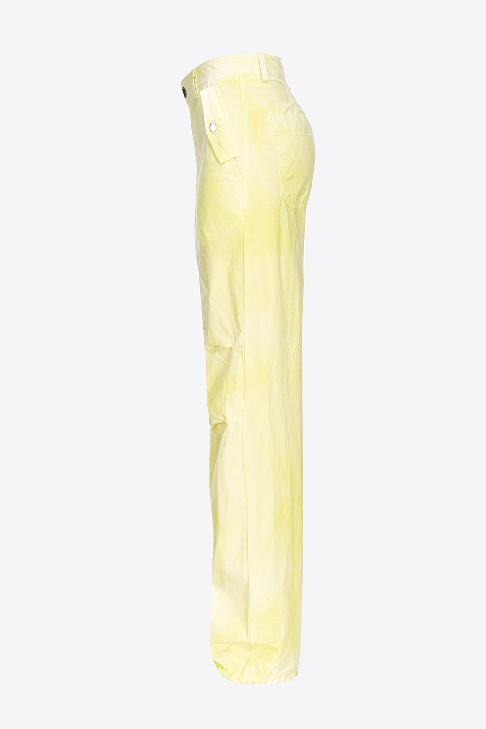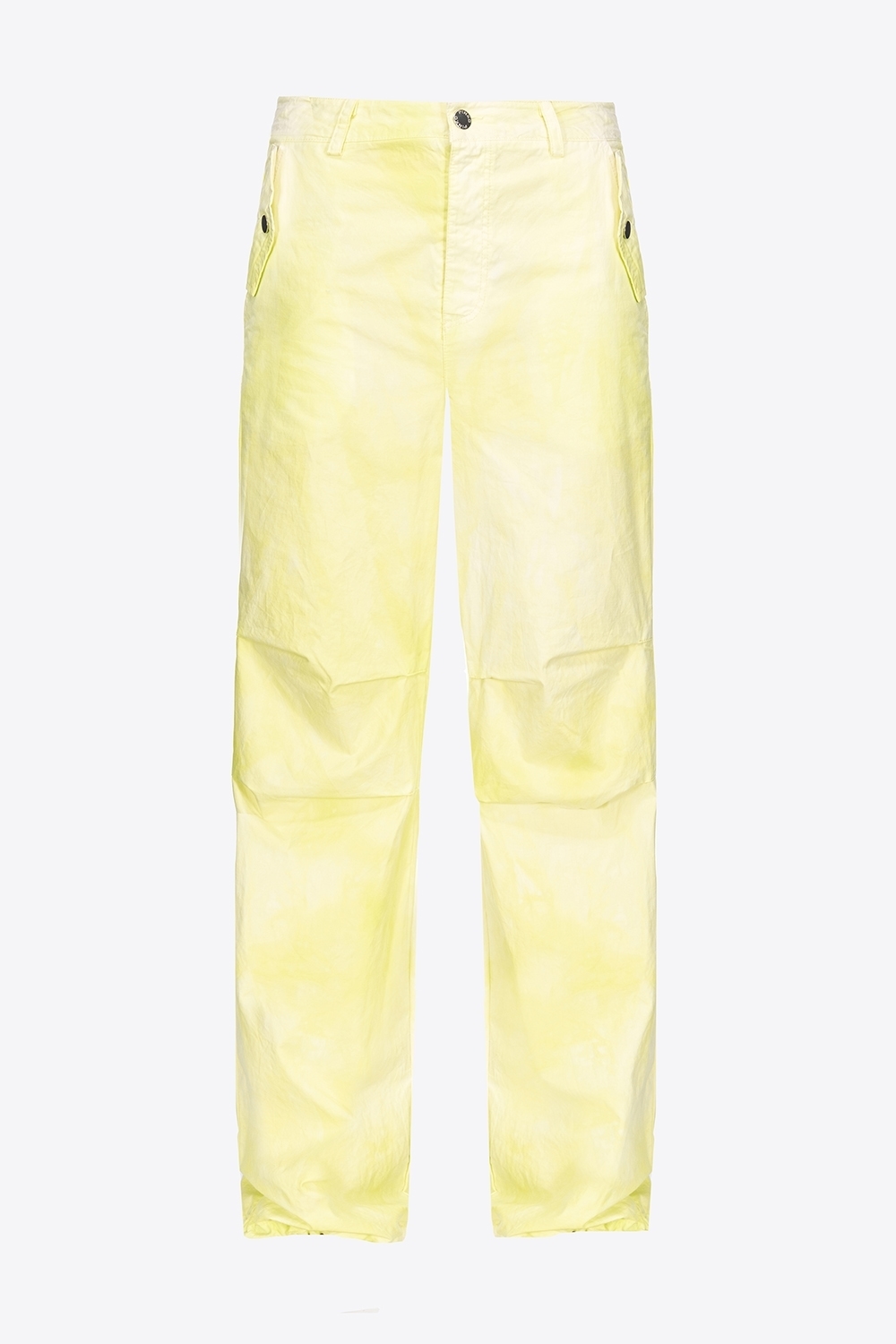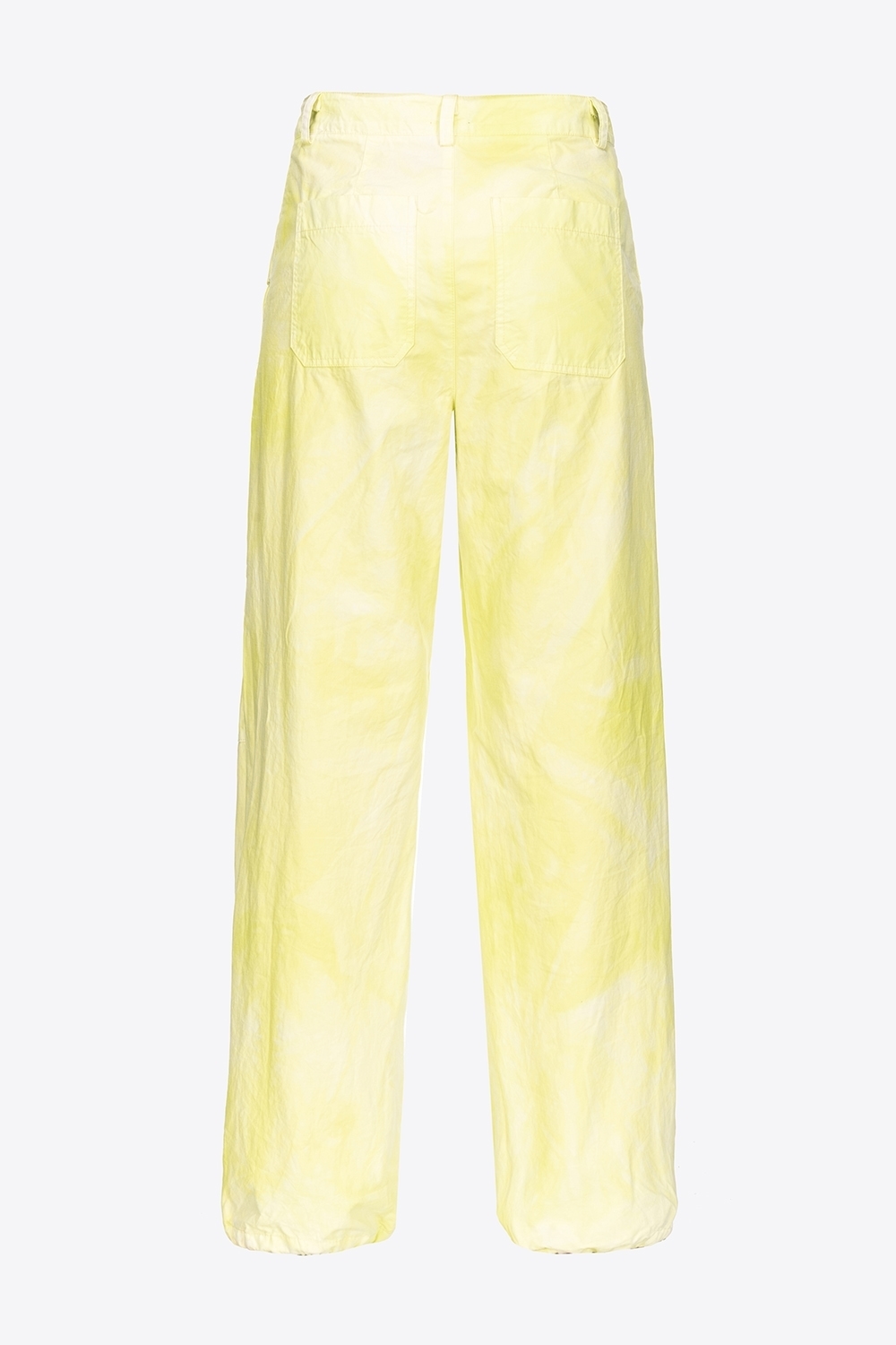 Pantaloni a gamba ampia stile utility in tela di cotone con trattamento tie&dye. Vita regular con passanti per cintura, tasche con patta a punta sui fianchi, tasche a toppa applicate sul retro. Dettaglio di coulisse inserita nell’orlo a fondo gamba. Chiusura con zip e bottone in metallo.
