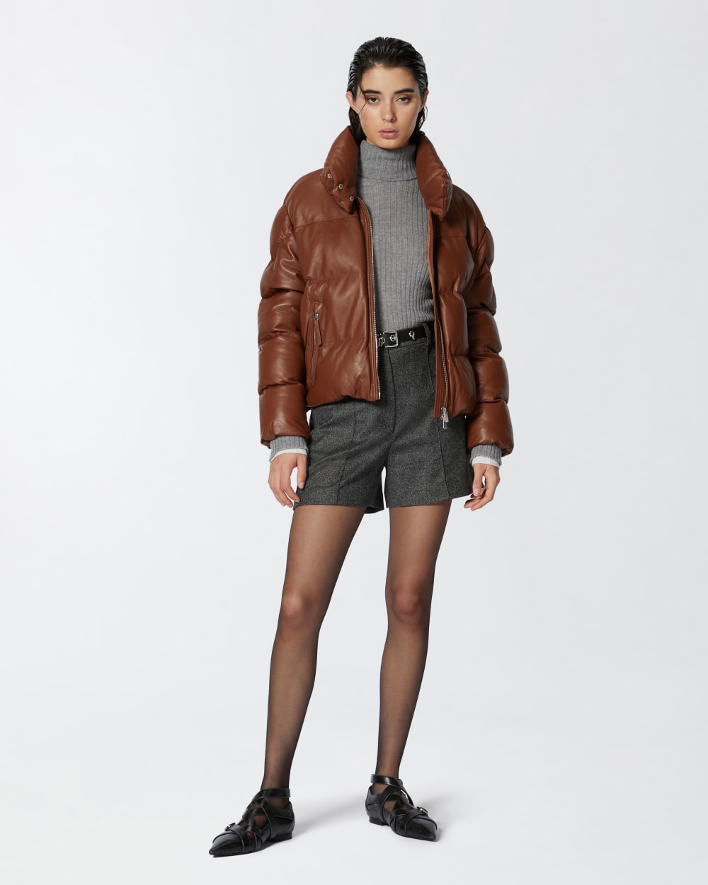 Pantaloncini shorts dal taglio sartoriale realizzati in tessuto twill di misto lana stretch. La linea dritta e leggermente ampia dei pantaloncini, caratterizzati da piega centrale davanti, tasche sui fianchi e tasche a doppio filetto con bottone sia davanti che sul retro. Indossa i pantaloncini con la giacca blazer abbinata per un update moderno al classico tailleur. Gli shorts sono personalizzati con inserto effetto pelle a forma triangolare nel centro dietro. Chiusura con bottone e zip nascosta.