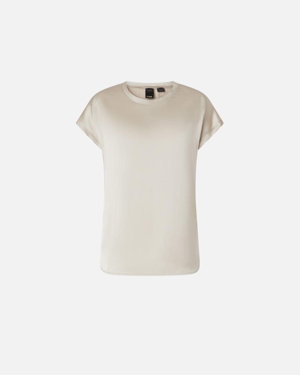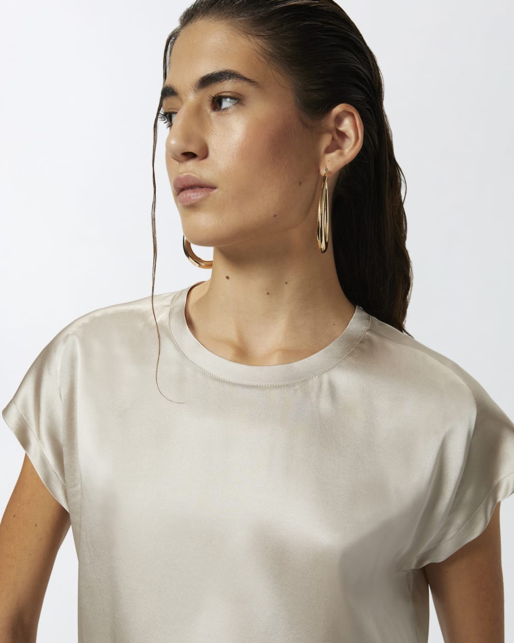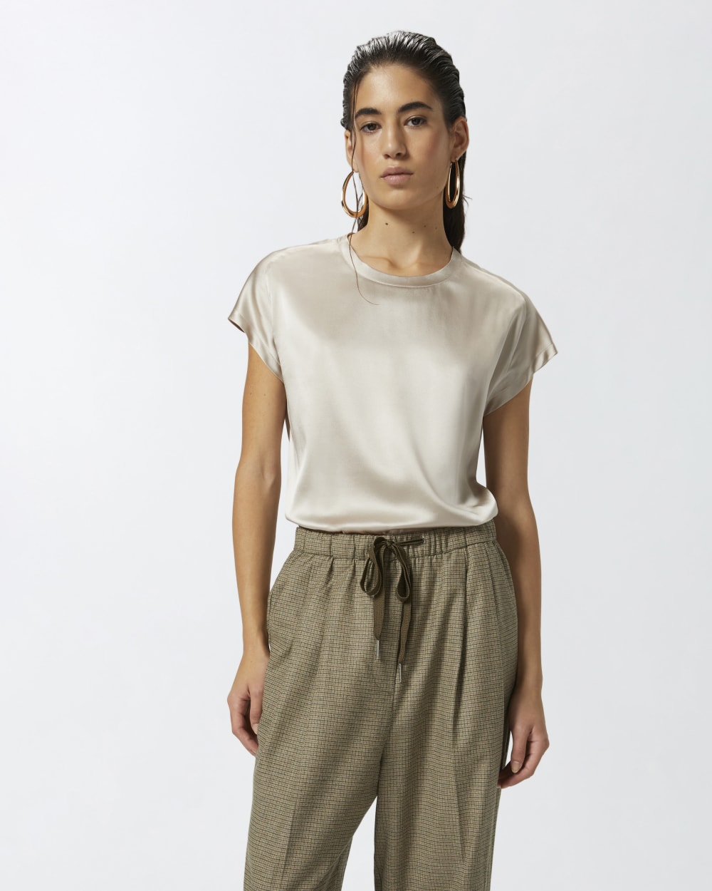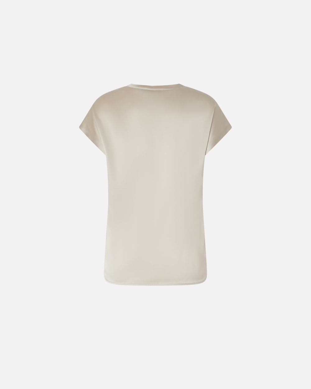 Blusa fluida a maniche corta in satin di misto seta stretch, dalla texture particolarmente leggera e lucida che la rende perfetta come tocco elegante in qualsiasi outfit. La blusa è caratterizzata da scollo tondo e fondo capo con orlo leggermente stondato.